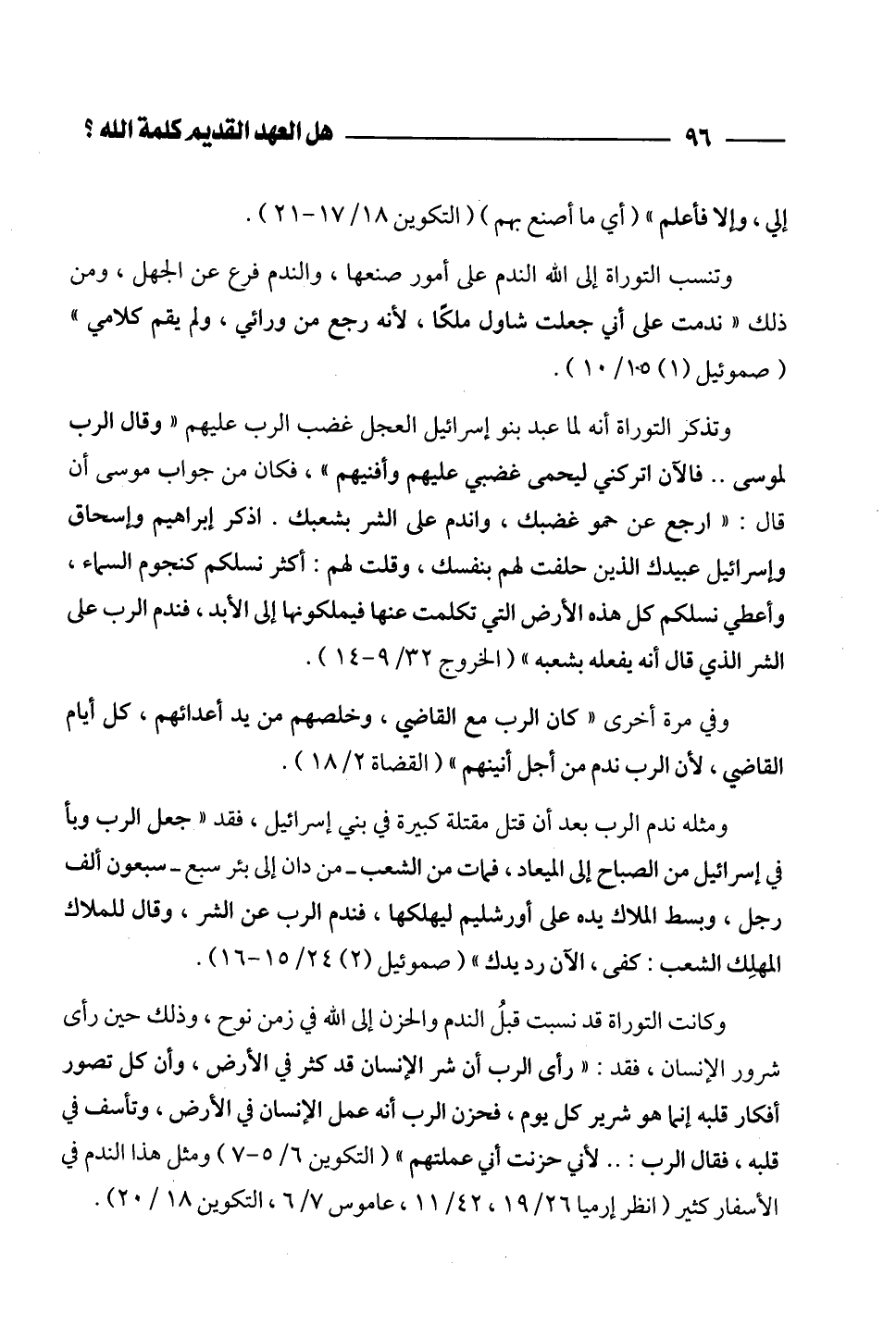 وكانت التوراة قد نسبت قبلُ الندم والحزن إلى الله في زمن نوح، وذلك حين رأى شرور الإنسان، فقد: "رأى الرب أن شر الإنسان قد كثر في الأرض، وأن كل تصور أفكار قلبه إنما هو شرير كل يوم، فحزن الرب أنه عمل الإنسان في الأرض، وتأسف في قلبه، فقال الرب: ... لأني حزنت أني عملتهم" (التكوين 6/ 5 - 7) ومثل هذا الندم في الأسفار كثير (انظر إرميا 26/ 19، 42/ 11، عاموس 7/ 6، التكوين 18/ 20).