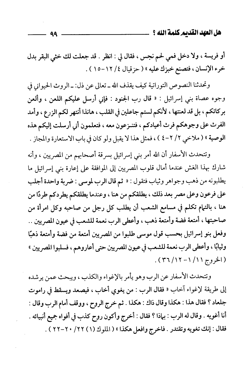 وتحدثنا النصوص التوراتية كيف يقذف الله - تعالى عن ذلك- الروث الحيواني في وجوه عصاة بني إسرائيل: "قال رب الجنود: فإني أرسل عليكم اللعن، وألعن بركاتكم، بل قد لعنتها، لأنكم لستم جاعلين في القلب، هانذا أنتهر لكم الزرع، وأمد الفرث على وجوهكم فرث أعيادكم، فتنزعون معه، فتعلمون أني أرسلت إليكم هذه الوصية" (ملاخي 2/ 2 - 4)، فمثل هذا لا يقبل ولو كان في باب الاستعارة والمجاز.