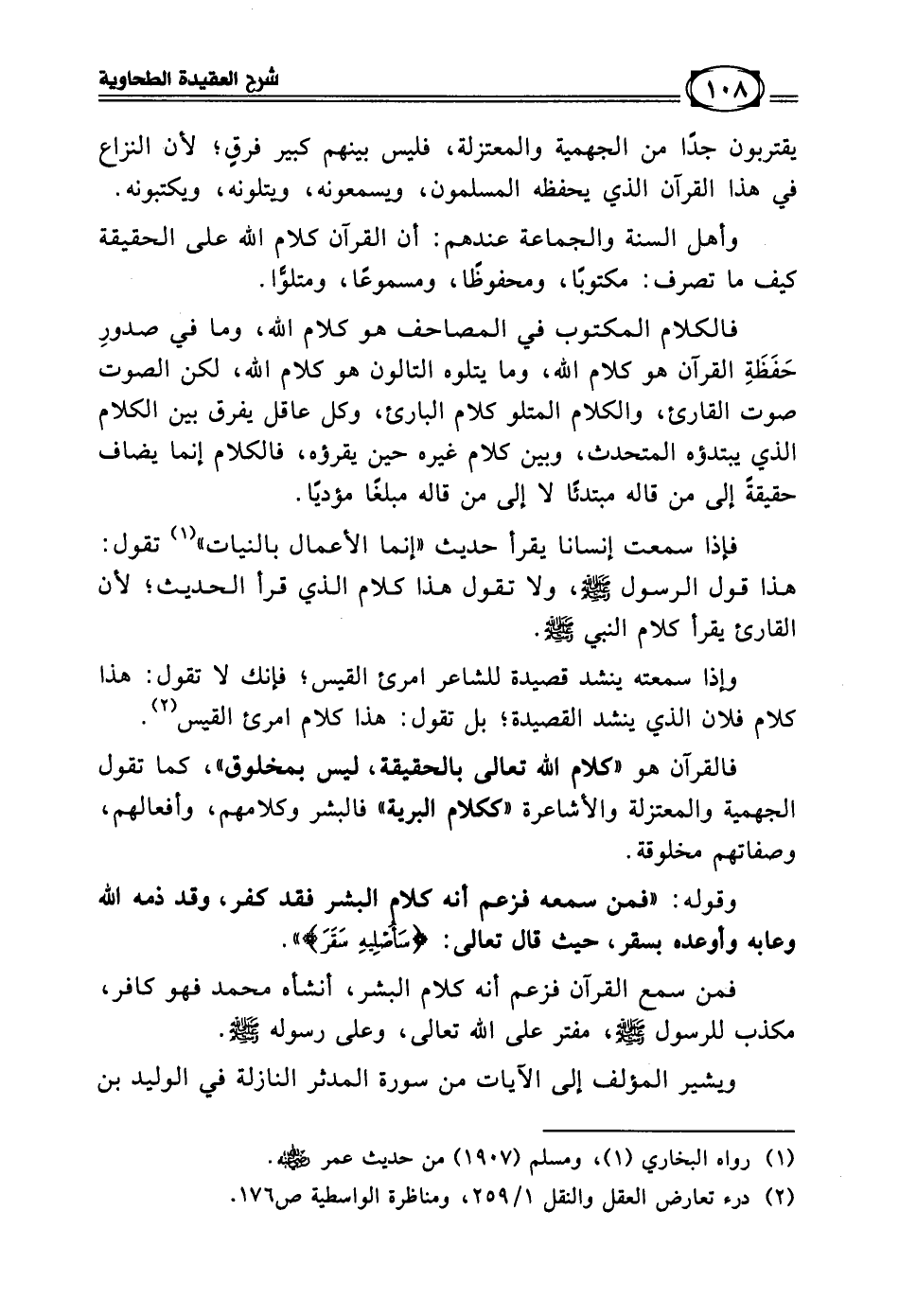 فالقرآن هو (كلام الله تعالى بالحقيقة، ليس بمخلوق)، كما تقول: الجهمية، والمعتزلة، والأشاعرة (ككلام البرية) فالبشر وكلامهم، وأفعالهم، وصفاتهم مخلوقة.