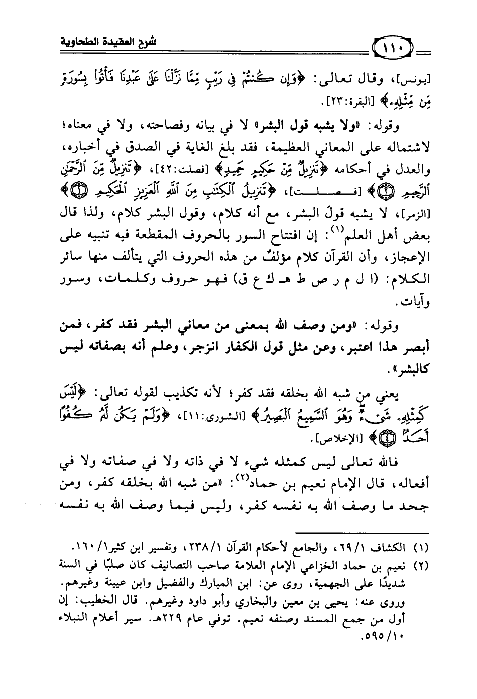 وقوله: (ولا يشبه قول البشر) لا في بيانه وفصاحته، ولا في معناه؛ لاشتماله على المعاني العظيمة في أخباره، فقد بلغ الغاية في الصدق في أخباره، والعدل في أحكامه ((تنزيلٌ من حكيمٌ حميد)) ((تنزيلٌ من الرحمن الرحيم)) ((تنزيل الكتاب من الله العزيز الحكيم))، لا يشبه قولَ البشر، مع أنه كلام، وقول البشر كلام، ولذا قال بعض أهل العلم (¬1): إن افتتاح السور بالحروف المقطعة فيه تنبيه على الإعجاز، وأن القرآن كلام مؤلفٌ من هذه الحروف التي يتألف منها سائر الكلام: (ال م رص ط هـ ك ع ق) فهو حروف وكلمات، وسور وآيات.