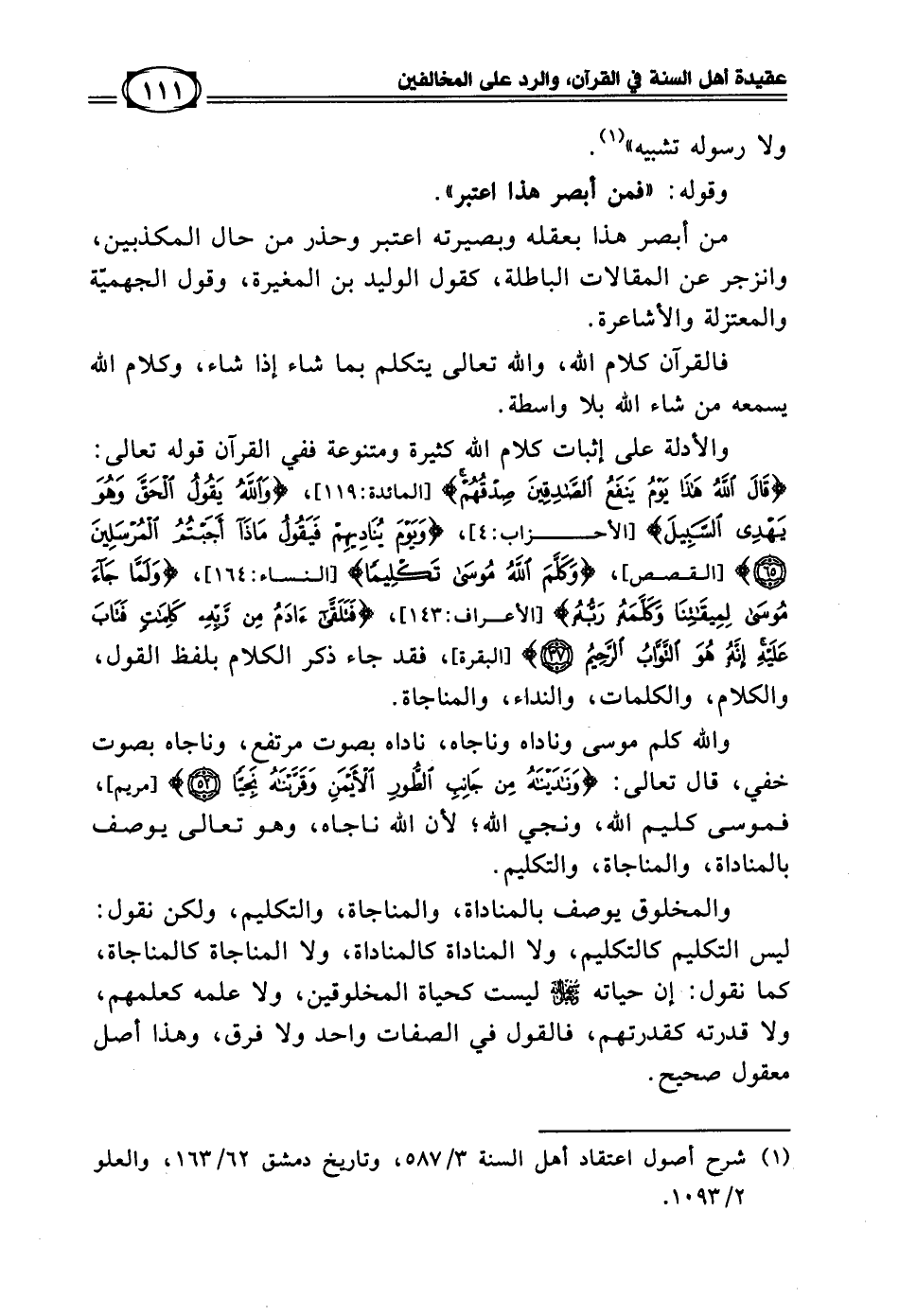 والمخلوق يوصف بالمناداة، والمناجاة، والتكليم، ولكن نقول: ليس التكليم كالتكليم، ولا المناداة كالمناداة، ولا المناجاة كالمناجاة، كما نقول: إن حياته سبحانه وتعالى ليست كحياة المخلوقين، ولا علمه كعلمهم، ولا قدرته كقدرتهم، فالقول في الصفات واحد ولا فرق، وهذا أصل معقول صحيح.