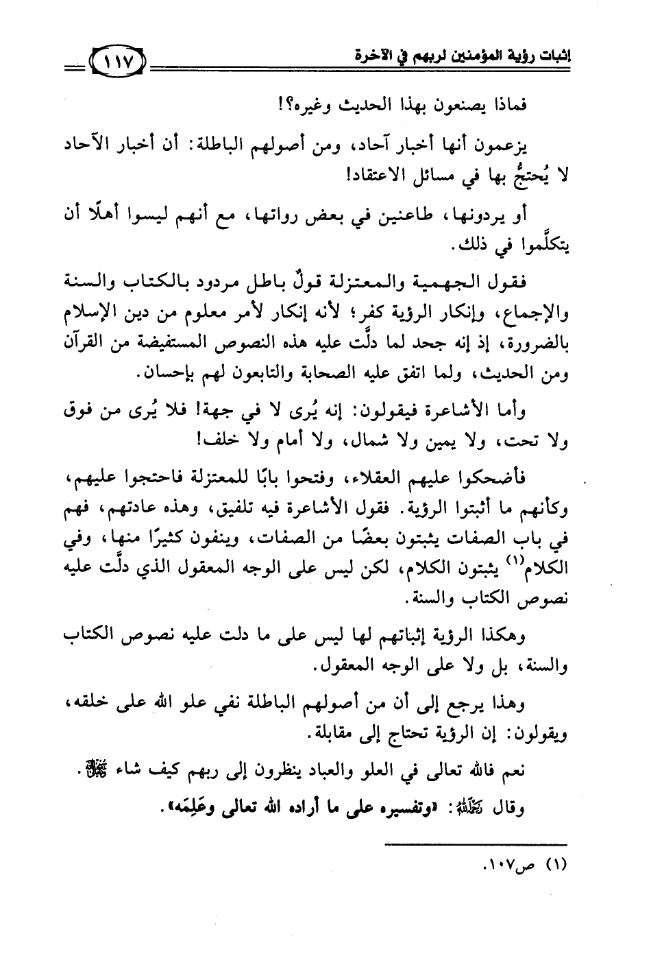 فقول الجهمية والمعتزلة قولٌ باطل مردود بالكتاب والسنة والإجماع، وإنكار الرؤية كفر؛ لأنه إنكار لأمر معلوم من دين الإسلام بالضرورة، إذ إنه جحد لما دلَّت عليه هذه النصوص المستفيضة من القرآن، ومن الحديث، ولما اتفق عليه الصحابة والتابعون لهم بإحسان.