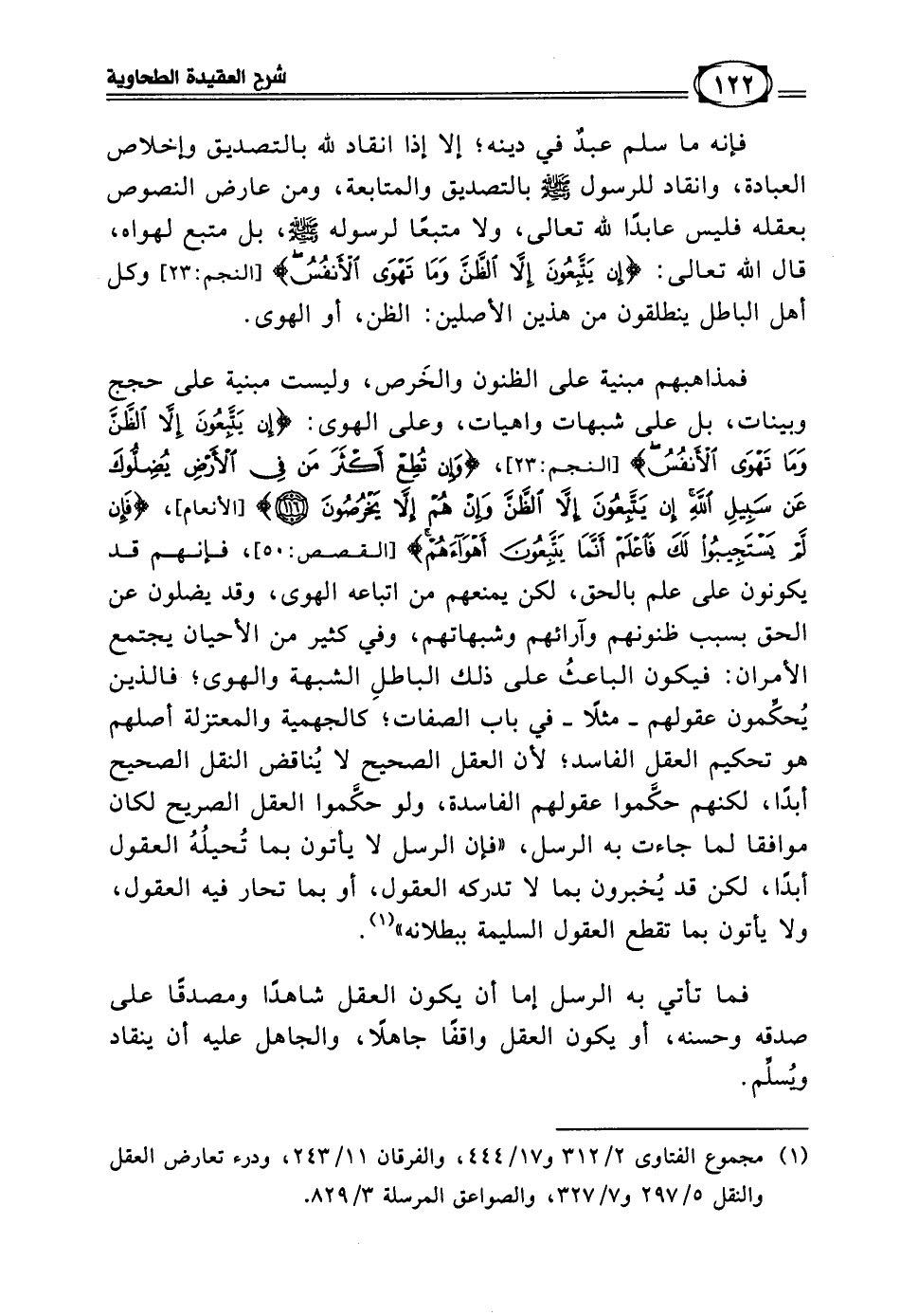 فإنه ما سلم عبدٌ في دينه؛ إلا إذا انقاد لله بالتصديق وإخلاص العبادة، وانقاد للرسول - صلى الله عليه وسلم - بالتصديق والمتابعة، ومن عارض النصوص بعقله فليس عابدا لله تعالى، ولا متبعا لرسوله - صلى الله عليه وسلم -، بل متبع لهواه، قال الله تعالى: ((إِنْ يَتَّبِعُونَ إِلَّا الظَّنَّ وَمَا تَهْوَى الأَنْفُسُ)) [النجم: 23] وكل أهل الباطل ينطلقون من هذين الأصلين: الظن، أو الهوى.
