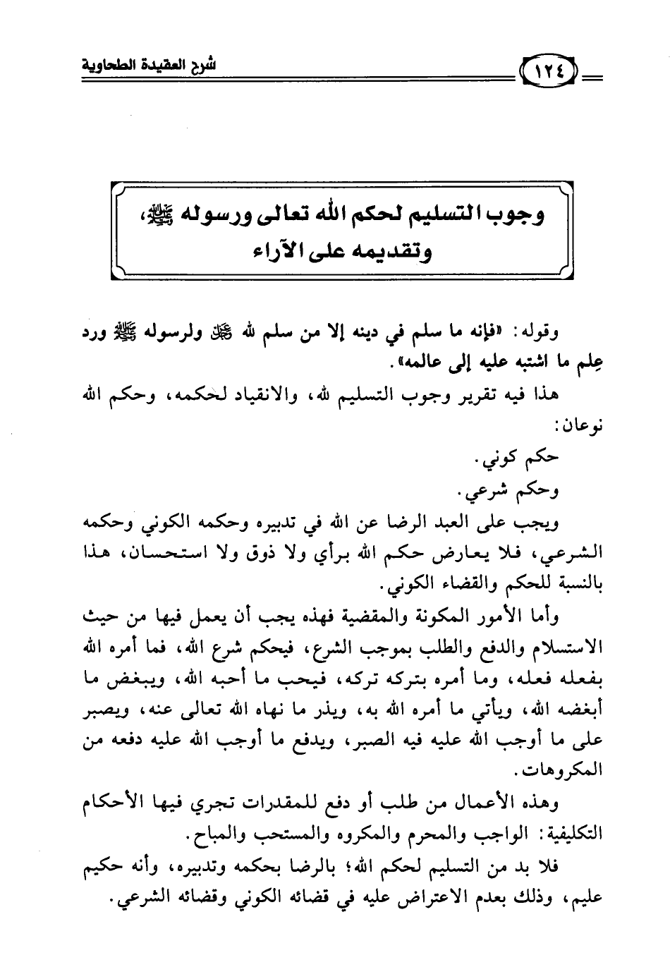 ويجب على العبد الرضا عن الله في تدبيره وحكمه الكوني وحكمه الشرعي، فلا يعارض حكم الله برأي ولا ذوق ولا استحسان، هذا بالنسبة للحكم والقضاء الكوني.