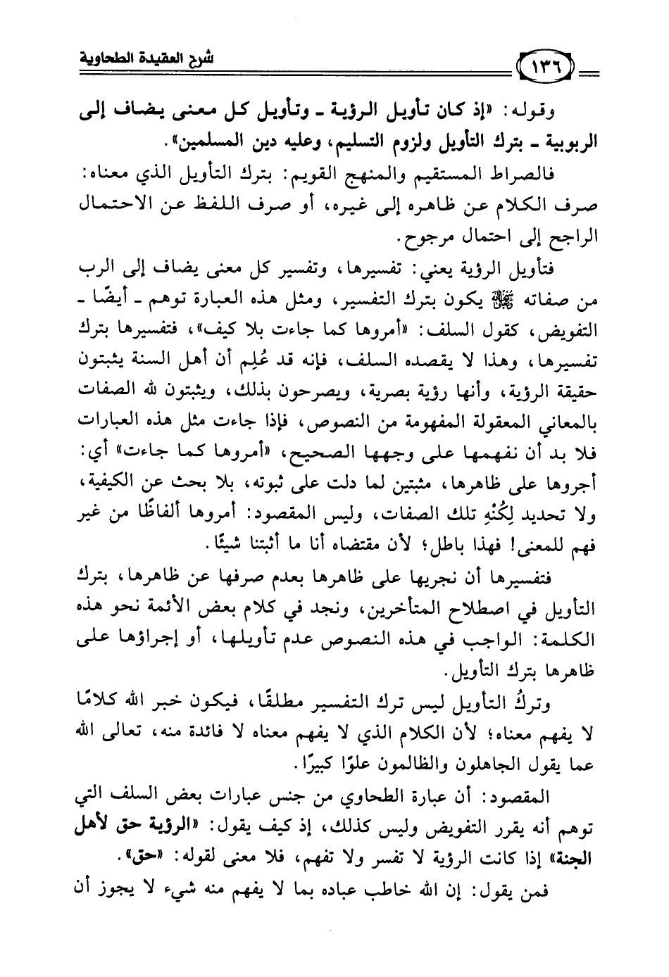 المقصود: أن عبارة الطحاوي من جنس عبارات بعض السلف التي توهم أنه يقرر التفويض وليس كذلك، إذ كيف يقول: (الرؤية حق لأهل الجنة) إذا كانت الرؤية لا تفسر ولا تفهم، فلا معنى لقوله: (حق).
