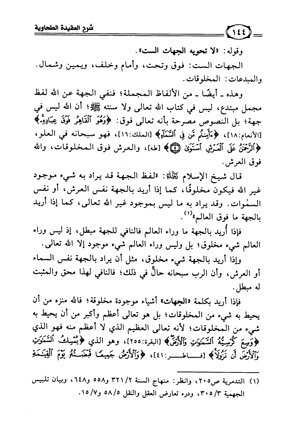 قال شيخ الإسلام رحمه الله: «لفظ الجهة قد يراد به شيء موجود غير الله فيكون مخلوقًا، كما إذا أريد بالجهة نفس العرش، أو نفس السماوات. وقد يراد به ما ليس بموجود غير الله تعالى، كما إذا أريد بالجهة ما فوق العالم». (¬1)