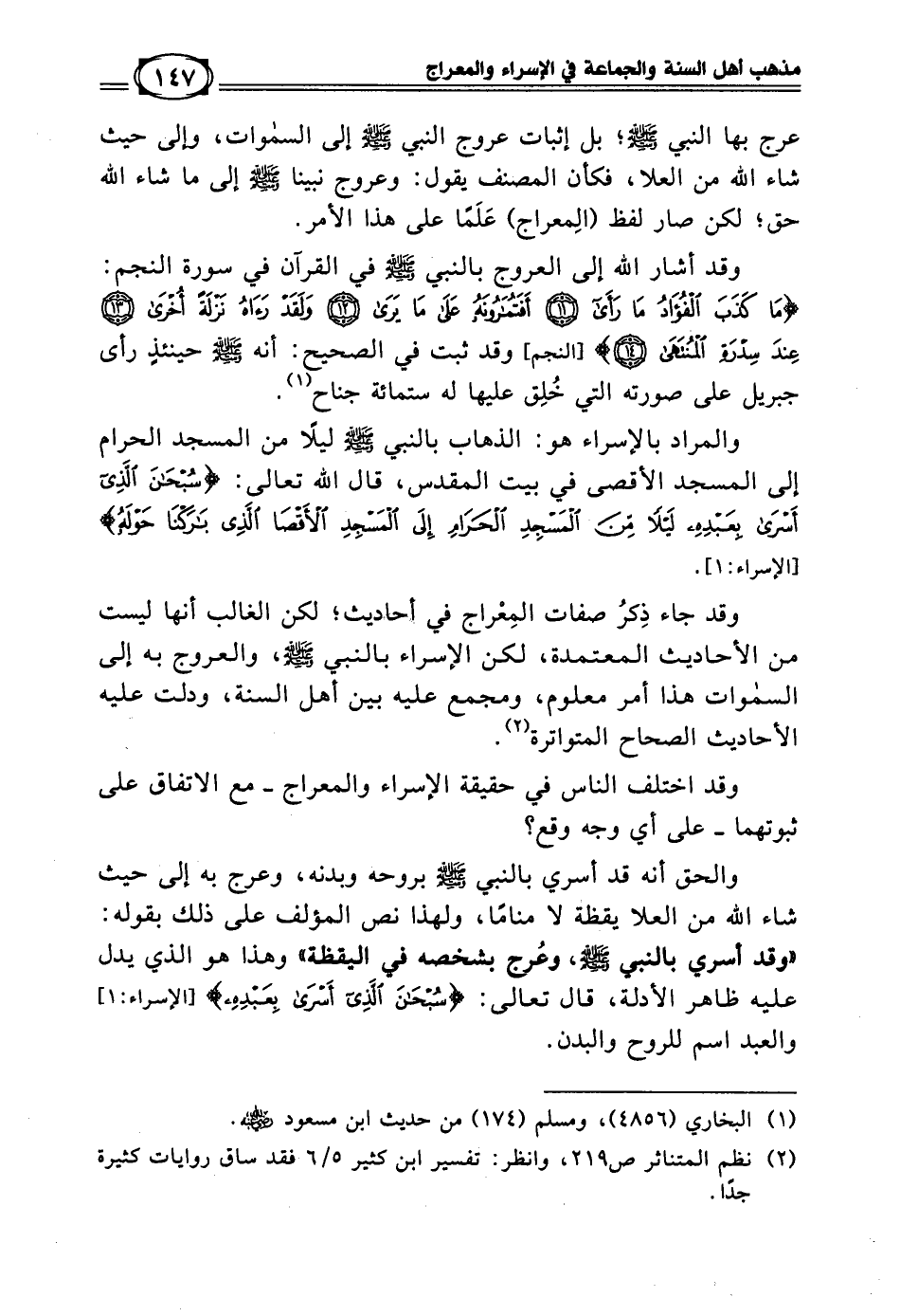 وقد أشار الله إلى العروج بالنبي - صلى الله عليه وسلم - في القرآن في سورة النجم: ((مَا كَذَبَ الْفُؤَادُ مَا رَأَى * أَفَتُمَارُونَهُ عَلَى مَا يَرَى * وَلَقَدْ رَآهُ نَزْلَةً أُخْرَى * عِنْدَ سِدْرَةِ الْمُنْتَهَى)) [النجم11 - 14] وقد ثبت في الصحيح: (أنه - صلى الله عليه وسلم - رأى جبريل على صورته التي خُلِق عليها له ستمائة جناح، مرتين) (¬1)