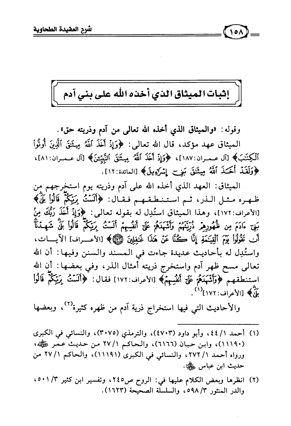 وقوله: (والميثاق الذي أخذه الله تعالى من آدم وذريته حق).