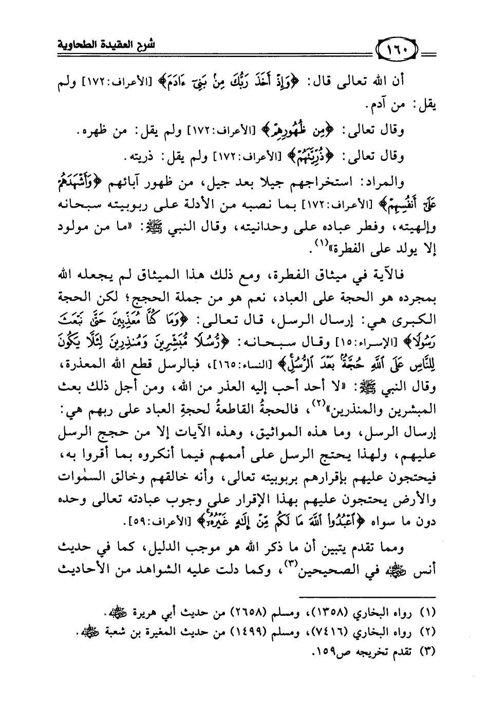 فالآية في ميثاق الفطرة، ومع ذلك هذا الميثاق لم يجعله الله بمجرده هو الحجة على العباد، نعم هو من جملة الحجج؛ لكن الحجة الكبرى هي: إرسال الرسل، قال تعالى: ((وَمَا كُنَّا مُعَذِّبِينَ حَتَّى نَبْعَثَ رَسُولَاً)) [الإسراء: 15] وقال سبحانه: ((رُسُلَاً مُبَشِّرِينَ وَمُنذِرِينَ لِئَلَّا يَكُونَ لِلنَّاسِ عَلَى اللَّهِ حُجَّةٌ بَعْدَ الرُّسُلِ)) [النساء: 165]، فبالرسل قطع الله المعذرة، وقال النبي - صلى الله عليه وسلم -: (لا أحد أحب إليه العذر من الله، ومن أجل ذلك بعث المبشرين والمنذرين) (¬2)، فالحجةُ القاطعةُ لحجةِ العباد على ربهم هي: إرسال الرسل، وما هذه المواثيق، وهذه الآيات إلا من حجج الرسل عليهم، ولهذا يحتج الرسل على أممهم فيما أنكروه بما أقروا به، فيحتجون عليهم بإقرارهم بربوبيته تعالى، وأنه خالقهم وخالق السماوات والأرض يحتجون عليهم بهذا الإقرار على وجوب عبادته تعالى وحده دون ما سواه ((اعْبُدُوا اللَّهَ مَا لَكُمْ مِنْ إِلَهٍ غَيْرُهُ)) [الأعراف: 59].