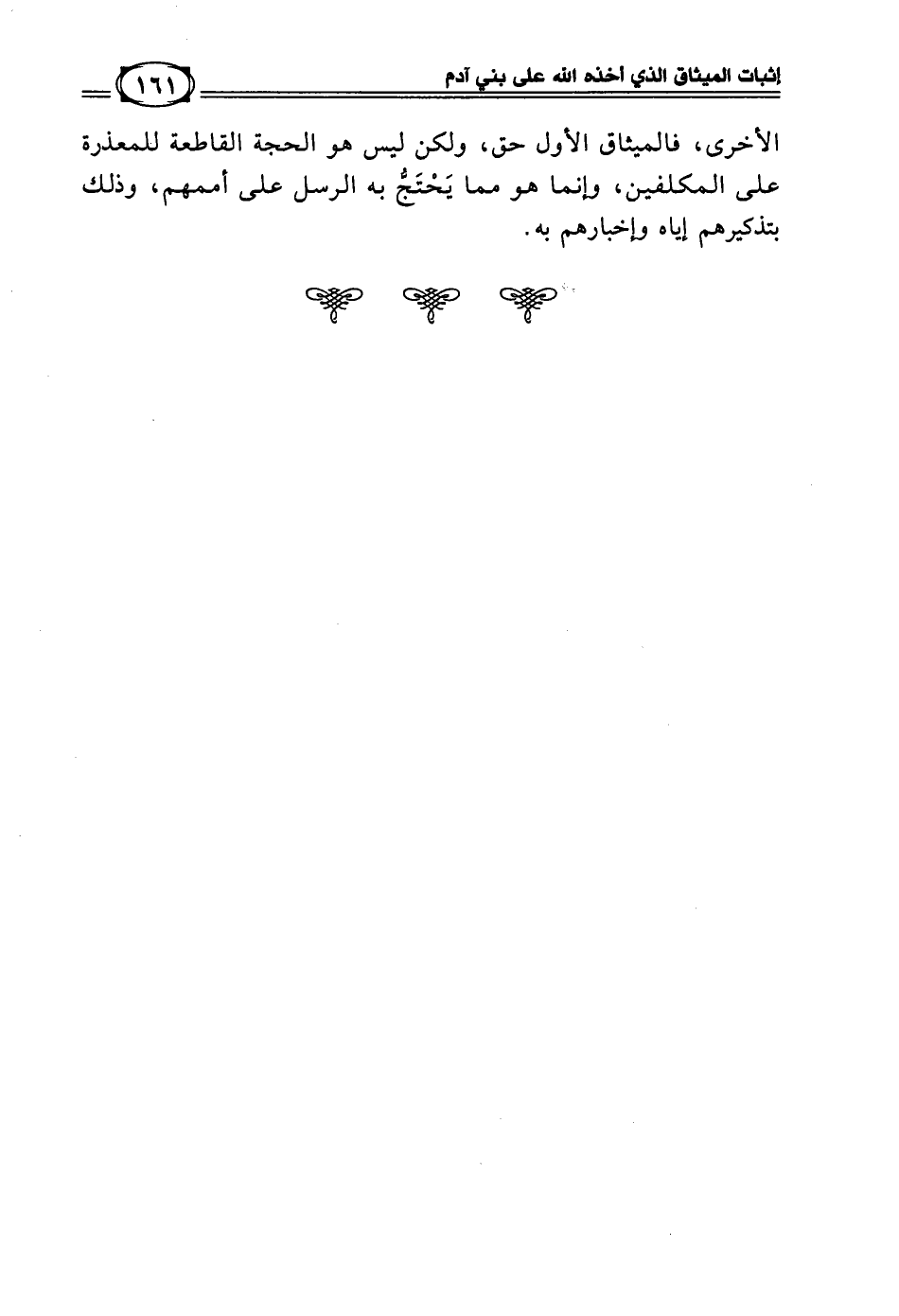 الأخرى، فالميثاق الأول حق، ولكن ليس هو الحجة القاطعة للمعذرة على المكلفين، وإنما هو مما يَحْتَجُ به الرسل على أممهم، وذلك بتذكيرهم إياه وإخبارهم به.