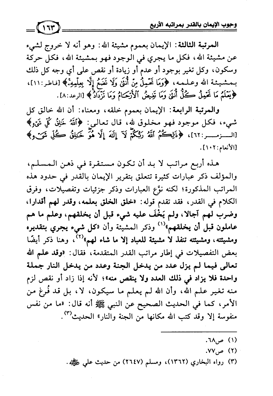 المرتبة الثالثة: الإيمان بعموم مشيئة الله: وهو أنه لا خروج لشيء عن مشيئة الله، فكل ما يجري في الوجود فهو بمشيئة الله، فكل حركة وسكون، وكل تغير بوجود أو عدم أو زيادة أو نقص على أي وجه كل ذلك بمشيئة الله، قال تعالى: {فَعَّالٌ لِّمَا يُرِيدُ} [البروج: 16] وقوله: {وَيَفْعَلُ اللهُ مَا يَشَاء} [إبراهيم: 27]، وقوله: {وَمَا تَشَاؤُونَ إِلَّا أَن يَشَاء اللَّهُ} [الإنسان: 30].