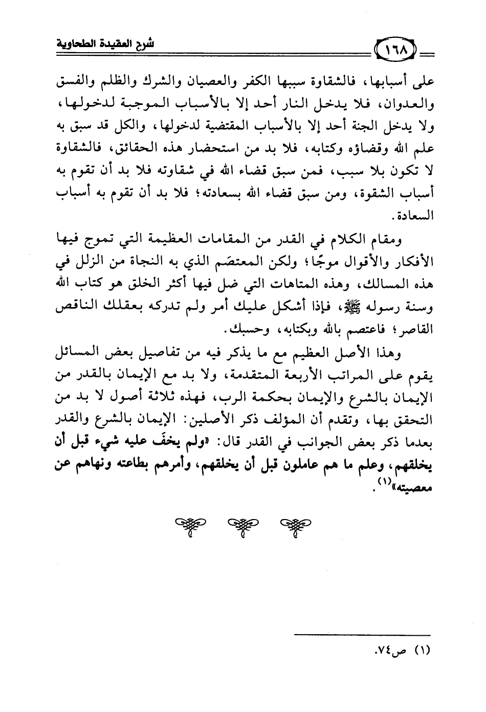 على أسبابها، فالشقاوة سببها الكفر والعصيان والشرك والظلم والفسق والعدوان، فلا يدخل النار أحد إلا بالأسباب الموجبة لدخولها، ولا يدخل الجنة أحد إلا بالأسباب المقتضية لدخولها، والكل قد سبق به علم الله وقضاؤه وكتابه، فلا بد من استحضار هذه الحقائق، فالشقاوة لا تكون بلا سبب، فمن سبق قضاء الله في شقاوته فلا بد أن تقوم به أسباب الشقوة، ومن سبق قضاء الله بسعادته؛ فلا بد أن تقوم به أسباب السعادة.