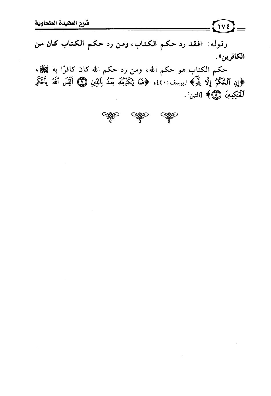 وقوله: (فقد رد حكم الكتاب، ومن رد حكم الكتاب كان من الكافرين) حكم الكتاب هو حكم الله، ومن رد حكم الله كان كافرا به سبحانه وتعالى، ((إِنِ الْحُكْمُ إِلَّا لِلَّهِ)) [يوسف: 40]، ((فَمَا يُكَذِّبُكَ بَعْدُ بِالدِّينِ * أَلَيْسَ اللَّهُ بِأَحْكَمِ الْحَاكِمِينَ)) [التين: 7 - 8].