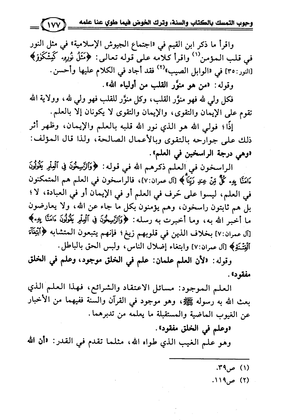 العلم الموجود: مسائل الاعتقاد والشرائع، فهذا العلم الذي بعث الله به رسوله - صلى الله عليه وسلم -، وهو موجود في القرآن والسنة ففيهما من الأخبار عن الغيوب الماضية والمستقبلة ما يعلمه من تدبرهما.