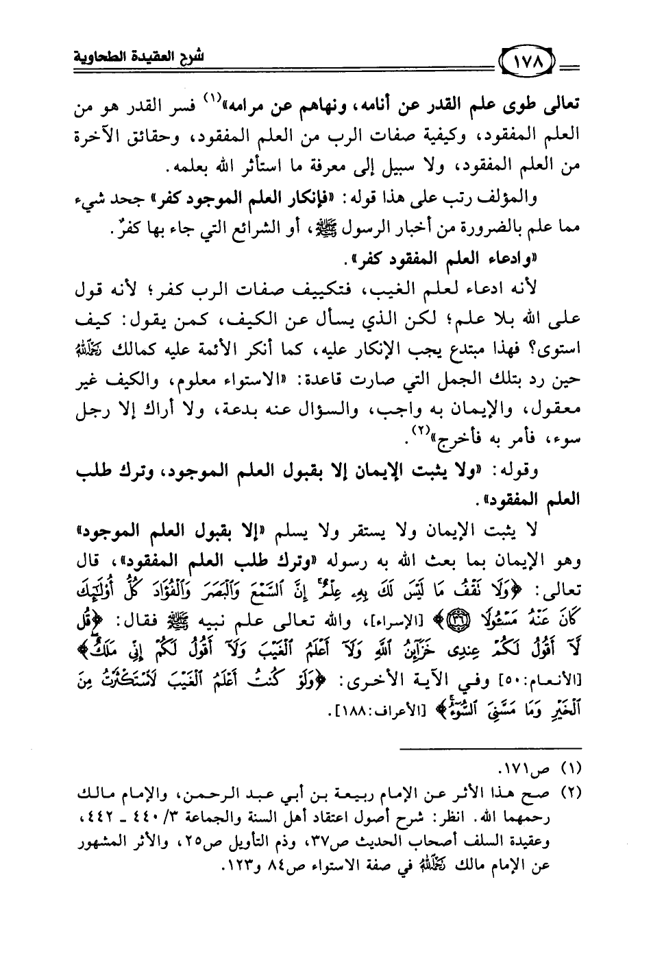لا يثبت الإيمان ولا يستقر ولا يسلم (إلا بقبول العلم الموجود) وهو الإيمان بما بعث الله به رسوله (وترك طلب العلم المفقود)، قال تعالى: ((وَلا تَقْفُ مَا لَيْسَ لَكَ بِهِ عِلْمٌ إِنَّ السَّمْعَ وَالْبَصَرَ وَالْفُؤَادَ كُلُّ أُوْلَئِكَ كَانَ عَنْهُ مَسْئُولَاً)) [الإسراء: 36]، والله تعالى علم نبيه - صلى الله عليه وسلم - فقال: ((قُلْ لا أَقُولُ لَكُمْ عِندِي خَزَائِنُ اللَّهِ وَلا أَعْلَمُ الْغَيْبَ وَلا أَقُولُ لَكُمْ إِنِّي مَلَكٌ)) [الأنعام: 50] وفي الآية الأخرى: ((وَلَوْ كُنتُ أَعْلَمُ الْغَيْبَ لاسْتَكْثَرْتُ مِنَ الْخَيْرِ وَمَا مَسَّنِيَ السُّوءُ)) [الأعراف: 188].