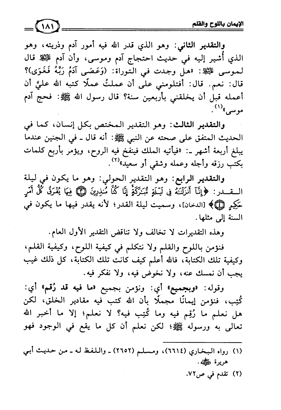 فنؤمن باللوح والقلم ولا نتكلم في كيفية اللوح، وكيفية القلم، وكيفية تلك الكتابة، فالله أعلم كيف كانت تلك الكتابة، كل ذلك غيب يجب أن نمسك عنه، ولا نخوض فيه، ولا نفكر فيه.