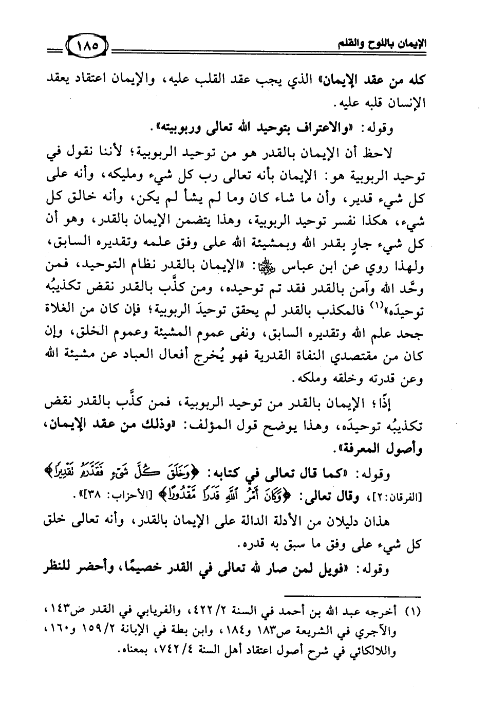 لاحظ أن الإيمان بالقدر هو من توحيد الربوبية؛ لأننا نقول في توحيد الربوبية هو: الإيمان بأنه تعالى رب كل شيء ومليكه، وأنه على كل شيء قدير، وأن ما شاء كان وما لم يشأ لم يكن، وأنه خالق كل شيء، هكذا نفسر توحيد الربوبية، وهذا يتضمن الإيمان بالقدر، وهو أن كل شيء جارٍ بقدر الله وبمشيئة الله على وفق علمه وتقديره السابق، ولهذا روي عن ابن عباس رضي الله عنهما: (الإيمان بالقدر نظام التوحيد، فمن وحَّد الله وآمن بالقدر فقد تم توحيده، ومن كذَّب بالقدر نقض تكذيبُه توحيده) (¬1) فالمكذب بالقدر لم يحقق توحيدَ الربوبية؛ فإن كان من الغلاة جحد علم الله وتقديره السابق، ونفى عموم المشيئة وعموم الخلق، وإن كان من مقتصدي النفاة القدرية فهو يُخرج أفعال العباد عن مشيئة الله وعن قدرته وخلقه وملكه.