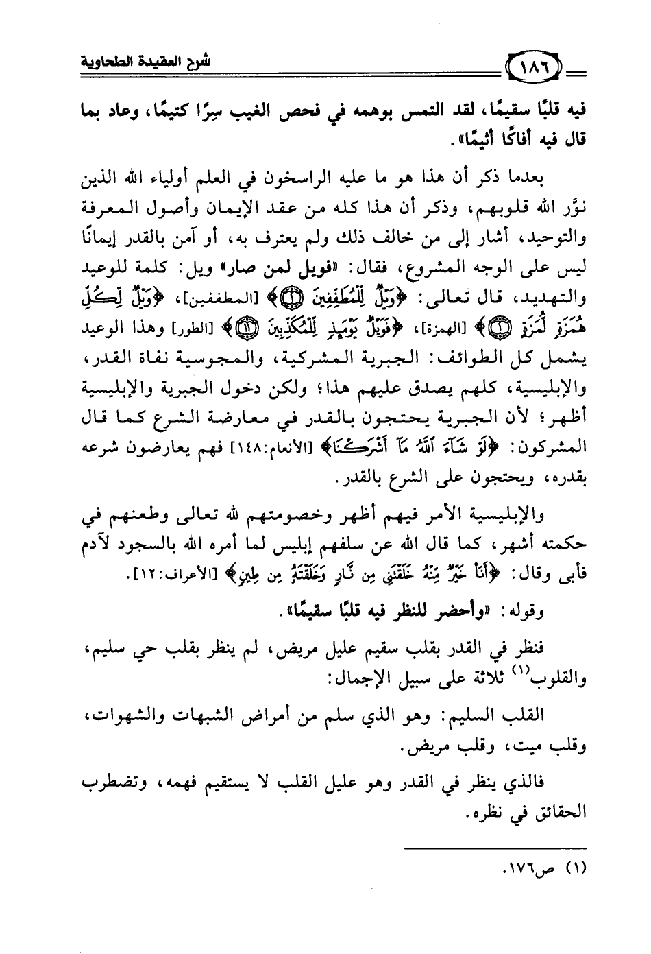 وقوله: (وأحضر للنظر) في القدر (قلبا سقيما) فنظر في القدر بقلب سقيم عليل مريض، لم ينظر بقلب حي سليم، والقلوب كما تقدم (¬1) ثلاثة على سبيل الإجمال: