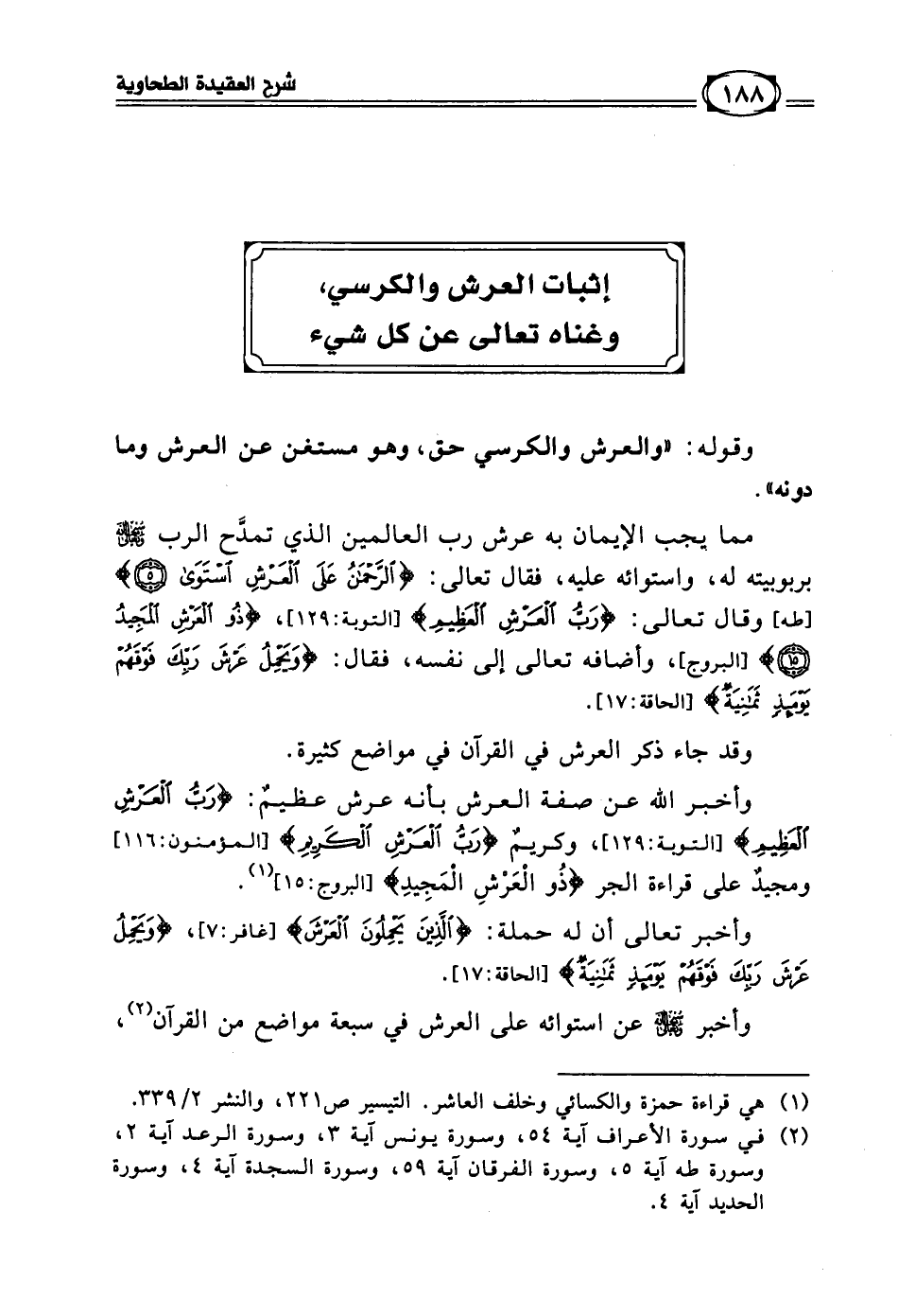 مما يجب الإيمان به عرش رب العالمين الذي تمدح الرب سبحانه وتعالى بربوبيته له، واستوائه عليه، فقال تعالى: ((الرَّحْمَنُ عَلَى الْعَرْشِ اسْتَوَى} [طه: 5] وقال تعالى: ((رَبُّ الْعَرْشِ الْعَظِيمِ)) [التوبة: 129]، ((ذُو الْعَرْشِ الْمَجِيدُ)) [البروج: 15]، وأضافه تعالى إلى نفسه، فقال: ((وَيَحْمِلُ عَرْشَ رَبِّكَ فَوْقَهُمْ يَوْمَئِذٍ ثَمَانِيَةٌ)) [الحاقة: 17].