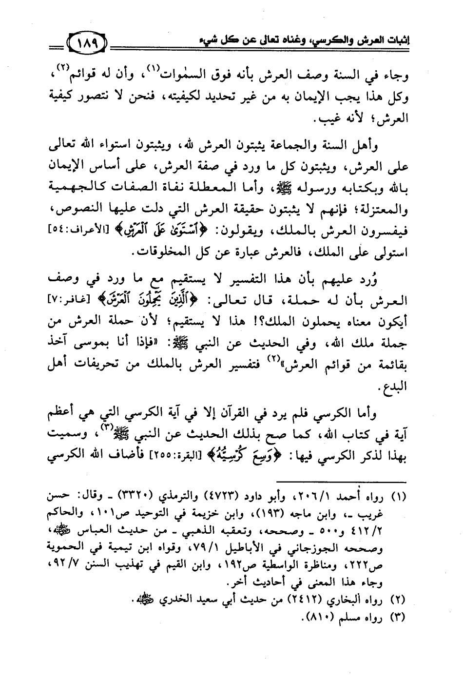 (¬1) رواه أحمد 1/ 206، وأبو داود (4723) والترمذي (3320) ـ وقال: حسن غريب ـ، وابن ماجه (193) وابن خزيمة في التوحيد ص 101، والحاكم 2/ 412 و 500 ـ وصححه، وتعقبه الذهبي ـ من حديث العباس - رضي الله عنه -، وصححه الجوزجاني في الأباطيل 1/ 79، وقواه ابن تيمية في الحموية ص 222، ومناظرة الواسطية 3/ 192، وابن القيم في تهذيب السنن7/ 92، وجاء هذا المعنى في أحاديث أخر]، وأن له قوائم [روى البخاري (2412) من حديث أبي سعيد الخدري - رضي الله عنه - أن النبي - صلى الله عليه وسلم - قال: «لا تخيروا بين الأنبياء فإن الناس يصعقون يوم القيامة، فأكون أول من تنشق عنه الأرض فإذا أنا بموسى آخذ بقائمة من قوائم العرش». الحديث.