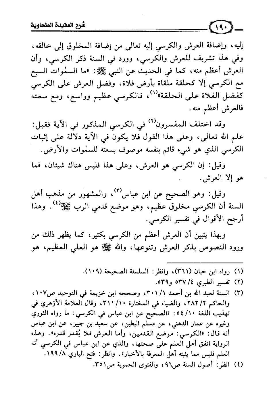 وقيل: وهو الصحيح عن ابن عباس (¬3)، والمشهور من مذهب أهل السنة أن الكرسي مخلوق عظيم، وهو موضع قدمي الرب سبحانه وتعالى. (¬4) وهذا أرجح الأقوال في تفسير الكرسي.