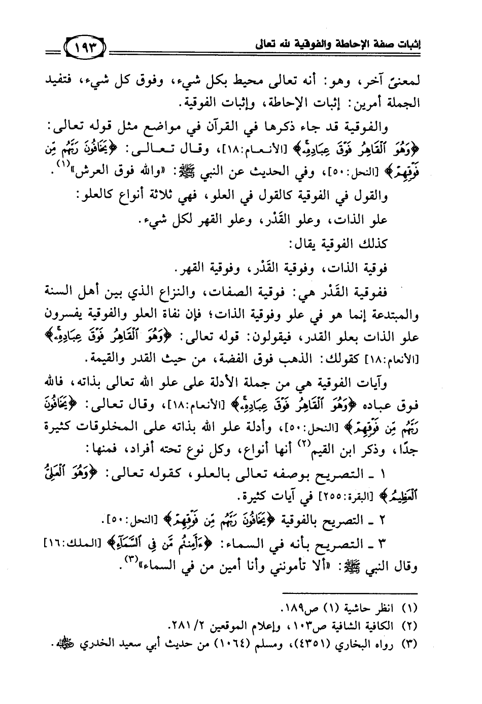 والفوقية قد جاء ذكرها في القرآن في مواضع مثل قوله تعالى: ((وَهُوَ الْقَاهِرُ فَوْقَ عِبَادِهِ)) [الأنعام: 18]، وقال تعالى: ((يَخَافُونَ رَبَّهُمْ مِنْ فَوْقِهِمْ)) [النحل: 50]، وفي الحديث عن النبي - صلى الله عليه وسلم -: (والله فوق العرش). (¬1)