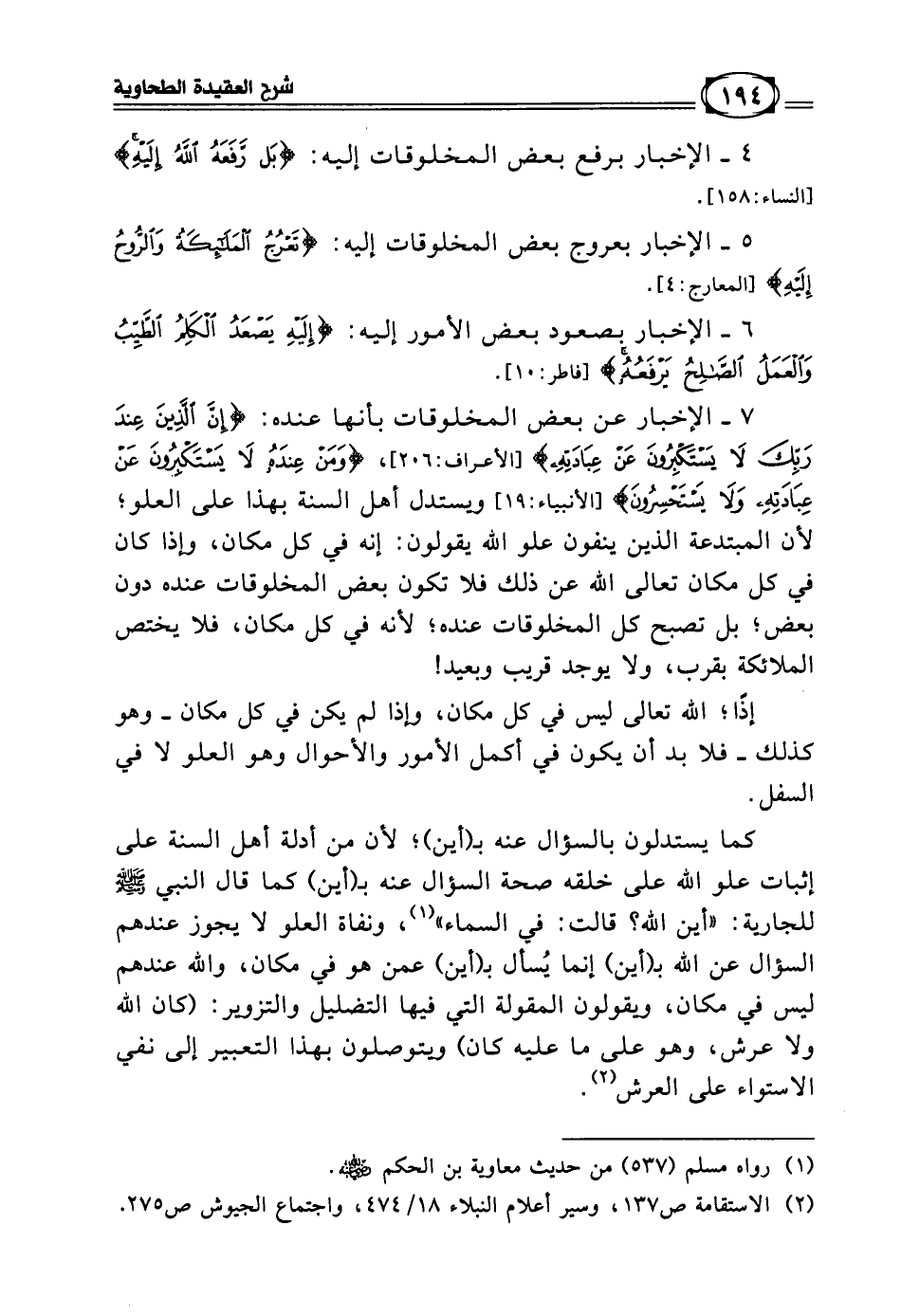7 - الإخبار عن بعض المخلوقات بأنها عنده: ((إِنَّ الَّذِينَ عِنْدَ رَبِّكَ لا يَسْتَكْبِرُونَ عَنْ عِبَادَتِهِ)) [الأعراف: 206]، ((وَمَنْ عِنْدَهُ لا يَسْتَكْبِرُونَ عَنْ عِبَادَتِهِ وَلا يَسْتَحْسِرُونَ)) [الأنبياء: 19] ويستدل أهل السنة بهذا على العلو؛ لأن المبتدعة الذين ينفون علو الله يقولون: إنه في كل مكان، وإذا كان في كل مكان ـ تعالى الله عن ذلك ـ فلا تكون بعض المخلوقات عنده دون بعض؛ بل تصبح كل المخلوقات عنده؛ لأنه في كل مكان، فلا يختص الملائكة بقرب ولا يوجد قريب وبعيد!