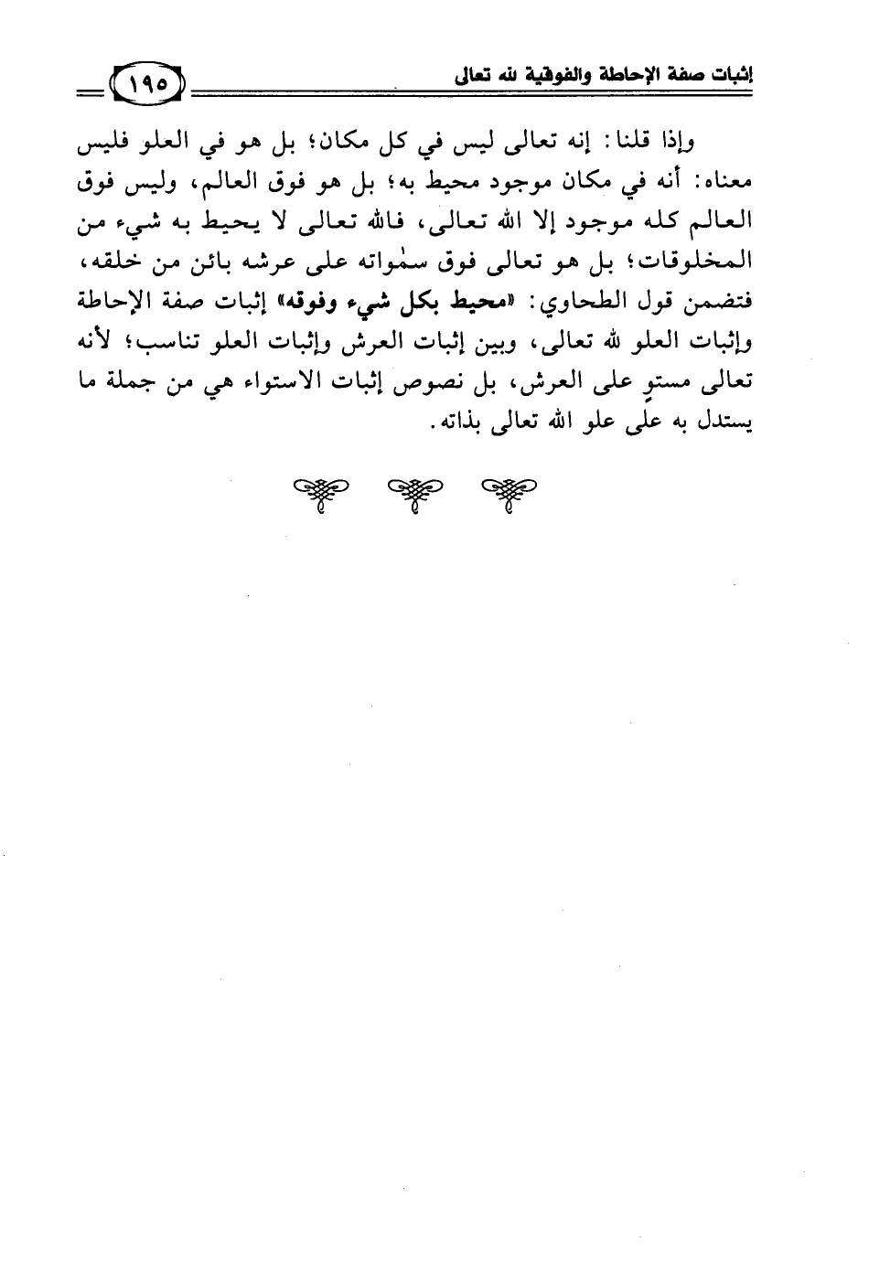 وإذا قلنا: إنه تعالى ليس في كل مكان؛ بل هو في العلو فليس معناه: أنه في مكان موجود محيط به؛ بل هو فوق العالم، وليس فوق العالم كله موجود إلا الله تعالى، فالله تعالى لا يحيط به شيء من مخلوقات؛ بل هو تعالى فوق سماواته على عرشه بائن من خلقه، فتضمن قول الطحاوي: (محيط بكل شيء وفوقه) إثبات صفة الإحاطة وإثبات العلو لله تعالى، وبين إثبات العرش وإثبات العلو تناسب؛ لأنه تعالى مستوٍ على العرش، بل نصوص إثبات الاستواء هي من جملة ما يستدل به على علو الله تعالى بذاته.