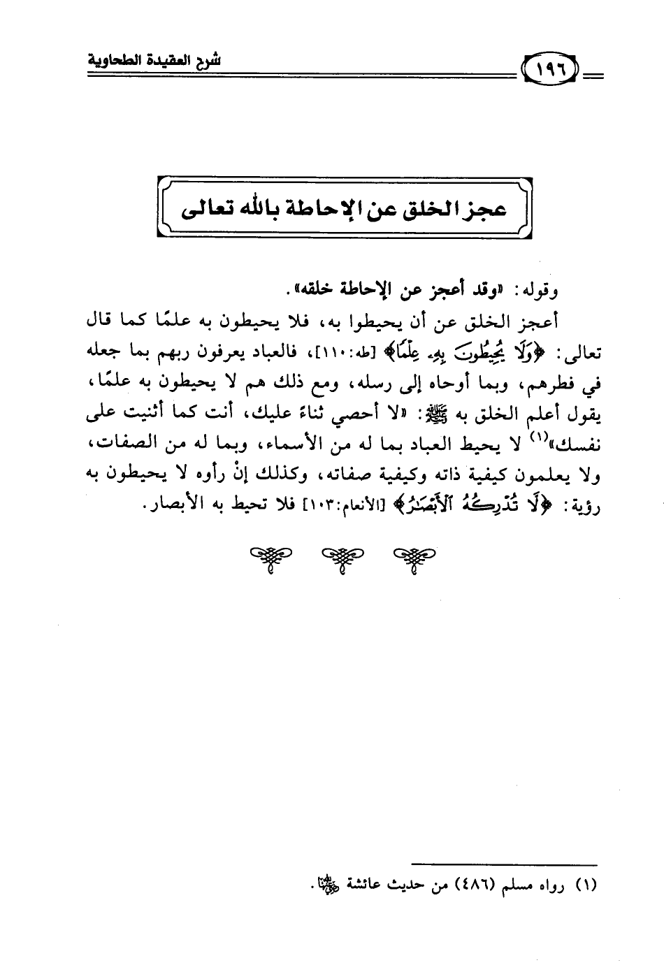 أعجز الخلق عن أن يحيطوا به، فلا يحيطون به علما كما قال تعالى: ((وَلا يُحِيطُونَ بِهِ عِلْمَاً)) [طه: 110]، فالعباد يعرفون ربهم بما جعله في فطرهم، وبما أوحاه إلى رسله، ومع ذلك هم لا يحيطون به علما، يقول أعلم الخلق به - صلى الله عليه وسلم -: (لا أحصي ثناءً عليك أنت كما أثنيت على نفسك) (¬1)] لا يحيط العباد بما له من الأسماء، وبما له من الصفات، ولا يعلمون كيفية ذاته وكيفية صفاته، وكذلك إنْ رأوه لا يحيطون به رؤية: ((لا تُدْرِكُهُ الأَبْصَارُ)) [الأنعام: 103] فلا تحيط به الأبصار.