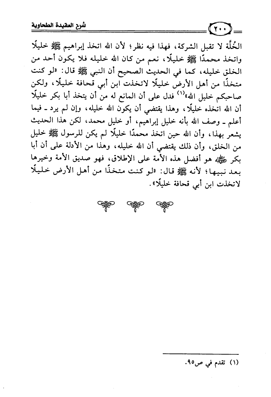 الخُلَّة لا تقبل الشركة، فهذا فيه نظر؛ لأن الله اتخذ إبراهيم - صلى الله عليه وسلم - خليلا واتخذ محمدا - صلى الله عليه وسلم - خليلا، نعم من كان الله خليله فلا يكون أحد من الخلق خليله، كما في الحديث الصحيح أن النبي - صلى الله عليه وسلم - (لو كنت متخذا من أهل الأرض خليلا لاتخذت ابن أبي قحافة خليلا، ولكن صاحبكم خليل الله) (¬1) فدل على أن المانع له من أن يتخذ أبا بكر خليلا أن الله اتخذه خليلا، وهذا يقتضي أن يكون الله خليله، وإن لم يرد ـ فيما أعلم ـ وصف الله بأنه خليل إبراهيم، أو خليل محمد، لكن هذا الحديث يشعر بهذا، وأن الله حين اتخذ محمدا خليلا لم يكن للرسول - صلى الله عليه وسلم - خليل من الخلق، وأن ذلك يقتضي أن الله خليله، وهذا من الأدلة على أن أبا بكر - رضي الله عنه - هو أفضل هذه الأمة على الإطلاق، فهو صديق الأمة وخيرها بعد نبيها؛ لأنه - صلى الله عليه وسلم - قال: (لو كنت متخذا من أهل الأرض خليلا لاتخذت ابن أبي قحافة خليلا).