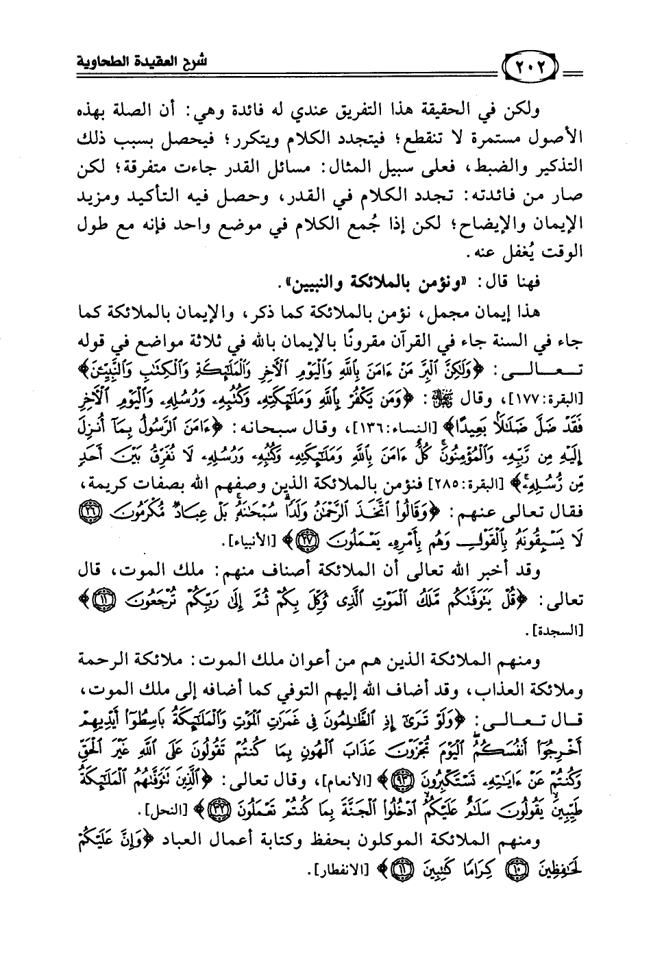 فهنا قال: (ونؤمن بالملائكة والنبيين) هذا إيمان مجمل، نؤمن بالملائكة كما ذكر، والإيمان بالملائكة كما جاء في السنة جاء في القرآن مقرونا بالإيمان بالله في ثلاثة مواضع في قوله تعالى: ((وَلَكِنَّ الْبِرَّ مَنْ آمَنَ بِاللَّهِ وَالْيَوْمِ الآخِرِ وَالْمَلائِكَةِ وَالْكِتَابِ وَالنَّبِيِّينَ)) [البقرة: 177]، وقال سبحانه وتعالى: ((وَمَنْ يَكْفُرْ بِاللَّهِ وَمَلائِكَتِهِ وَكُتُبِهِ وَرُسُلِهِ وَالْيَوْمِ الآخِرِ وَالْيَوْمِ الآخِرِ فَقَدْ ضَلَّ ضَلالَاً بَعِيدَاً)) [النساء: 136]، وقال سبحانه: ((آمَنَ الرَّسُولُ بِمَا أُنزِلَ إِلَيْهِ مِنْ رَبِّهِ وَالْمُؤْمِنُونَ كُلٌّ آمَنَ بِاللَّهِ وَمَلائِكَتِهِ وَكُتُبِهِ وَرُسُلِهِ لا نُفَرِّقُ بَيْنَ أَحَدٍ مِنْ رُسُلِهِ)) [البقرة: 285] فنؤمن بالملائكة الذين وصفهم الله بصفات كريمة، فقال تعالى عنهم: ((وَقَالُوا اتَّخَذَ الرَّحْمَنُ وَلَدَاً سُبْحَانَهُ بَلْ عِبَادٌ مُكْرَمُونَ * لا يَسْبِقُونَهُ بِالْقَوْلِ وَهُمْ بِأَمْرِهِ يَعْمَلُونَ * يَعْلَمُ مَا بَيْنَ أَيْدِيهِمْ وَمَا خَلْفَهُمْ وَلا يَشْفَعُونَ إِلَّا لِمَنِ ارْتَضَى وَهُمْ مِنْ خَشْيَتِهِ مُشْفِقُونَ)) [الأنبياء: 26 - 28].