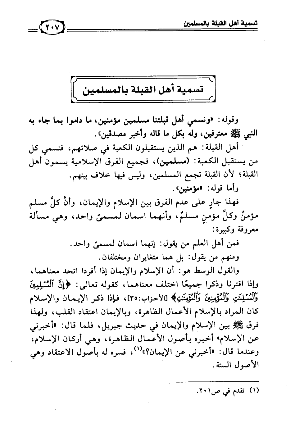وقوله: (ونسمي أهل قبلتنا مسلمين مؤمنين، ما داموا بما جاء به النبي - صلى الله عليه وسلم - معترفين، وله بكل ما قاله وأخبر مصدقين).