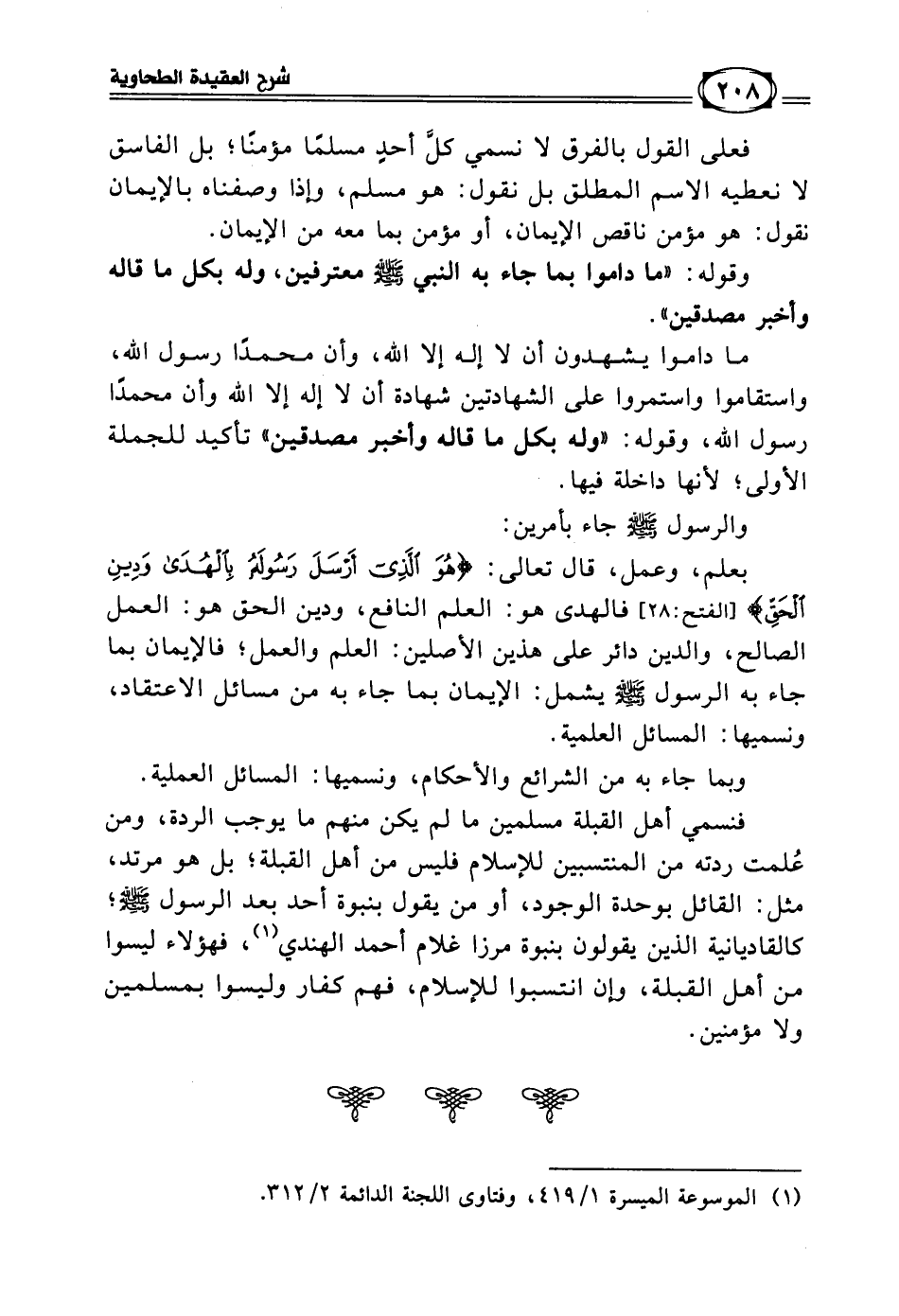 فنسمي أهل القبلة مسلمين ما لم يكن منهم ما يوجب الردة، ومن عُلمت ردته من المنتسبين للإسلام فليس من أهل القبلة؛ بل هو مرتد، مثل: القائل بوحدة الوجود، أو من يقول بنبوة أحد غير الرسول - صلى الله عليه وسلم -؛ كالقاديانية الذين يقولون بنبوة مرزا غلام أحمد الهندي (¬1)، فهؤلاء ليسوا من أهل القبلة، وليسوا بمسلمين ولا مؤمنين، وإن انتسبوا للإسلام، فهم كفار وليسوا بمسلمين ولا مؤمنين.