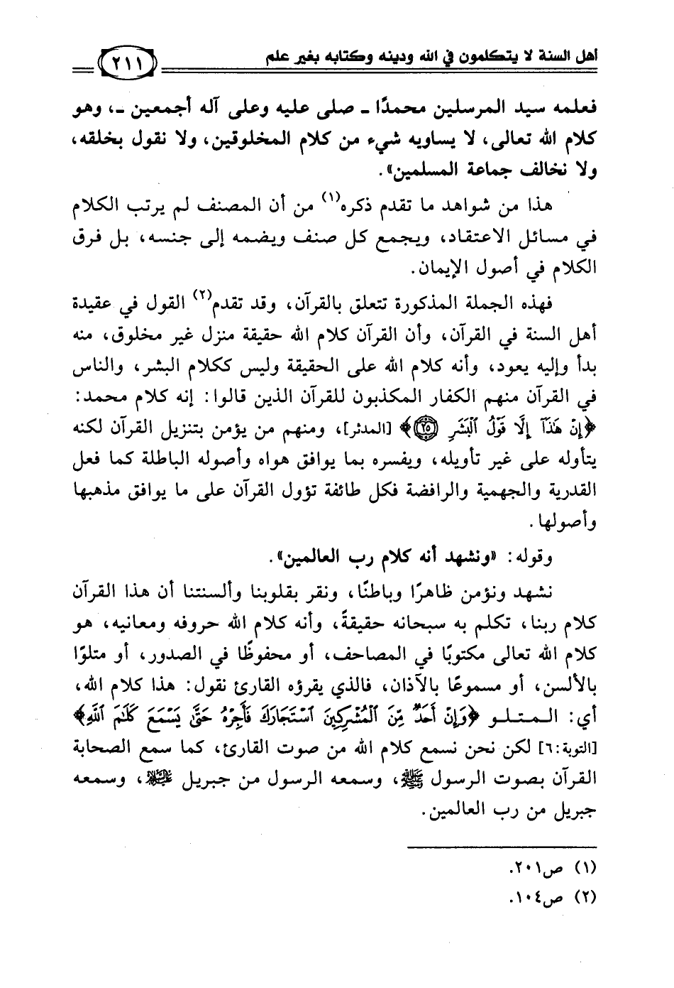 نشهد ونؤمن ظاهرا وباطنا، ونقر بقلوبنا وألسنتنا أن هذا القرآن كلام ربنا، تكلم به سبحانه حقيقةً، وأنه كلام الله حروفه ومعانيه، هو كلام الله تعالى مكتوبا في المصاحف، أو محفوظا في الصدور، أو متلوا بالألسن، أو مسموعا بالآذان، فالذي يقرأه القارئ نقول: هذا كلام الله، أي: المتلو ((وَإِنْ أَحَدٌ مِنَ الْمُشْرِكِينَ اسْتَجَارَكَ فَأَجِرْهُ حَتَّى يَسْمَعَ كَلامَ اللَّهِ)) [التوبة: 6] لكن نحن نسمع كلام الله من صوت القارئ، كما سمع الصحابة القرآن بصوت الرسول - صلى الله عليه وسلم -، وسمعه الرسول من جبريل عليه السلام، وسمعه جبريل من رب العالمين.