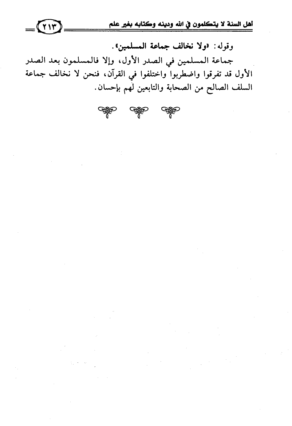 جماعة المسلمين في الصدر الأول، وإلا فالمسلمون بعد الصدر الأول قد تفرقوا واضطربوا واختلفوا في القرآن، فنحن لا نخالف جماعة السلف الصالح من الصحابة والتابعين لهم بإحسان.