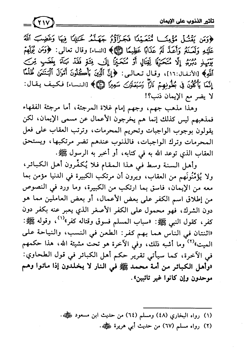 ((وَمَنْ يَقْتُلْ مُؤْمِنَاً مُتَعَمِّدَاً فَجَزَاؤُهُ جَهَنَّمُ خَالِدًا فِيهَا وَغَضِبَ اللهُ عَلَيْهِ وَلَعَنَهُ وَأَعَدَّ لَهُ عَذَابًا عَظِيمًا)) [النساء: 93] وقال تعالى: ((وَمَنْ يُوَلِّهِمْ يَوْمَئِذٍ دُبُرَهُ إِلَّا مُتَحَرِّفَاً لِقِتَالٍ أَوْ مُتَحَيِّزَاً إِلَى فِئَةٍ فَقَدْ بَاءَ بِغَضَبٍ مِنَ اللَّهِ)) [الأنفال: 16]، وقال تعالى: ((إِنَّ الَّذِينَ يَأْكُلُونَ أَمْوَالَ الْيَتَامَى ظُلْمَاً إِنَّمَا يَأْكُلُونَ فِي بُطُونِهِمْ نَارَاً وَسَيَصْلَوْنَ سَعِيرَاً)) [النساء: 10] فكيف يقال: لا يضر مع الإيمان ذنب؟!
