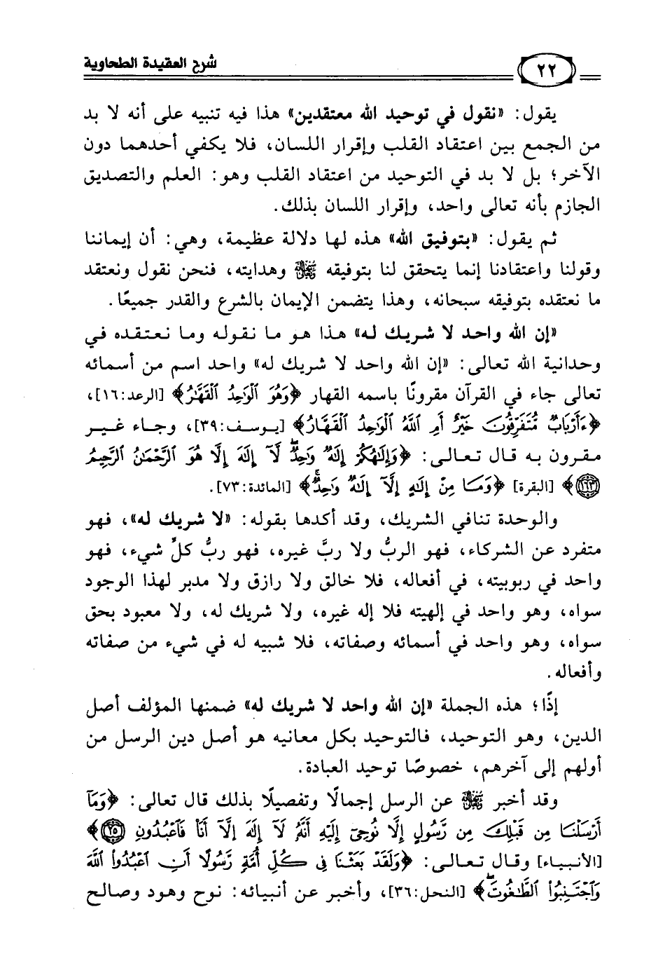 يقول: «نقول في توحيد الله معتقدين» هذا فيه تنبيه على أنه لا بد من الجمع بين اعتقاد القلب وإقرار اللسان، فلا يكفي أحدهما دون الآخر، لا بد في التوحيد من اعتقاد القلب وهو: العلم والتصديق الجازم بأنه تعالى واحد، وإقرار اللسان بذلك.