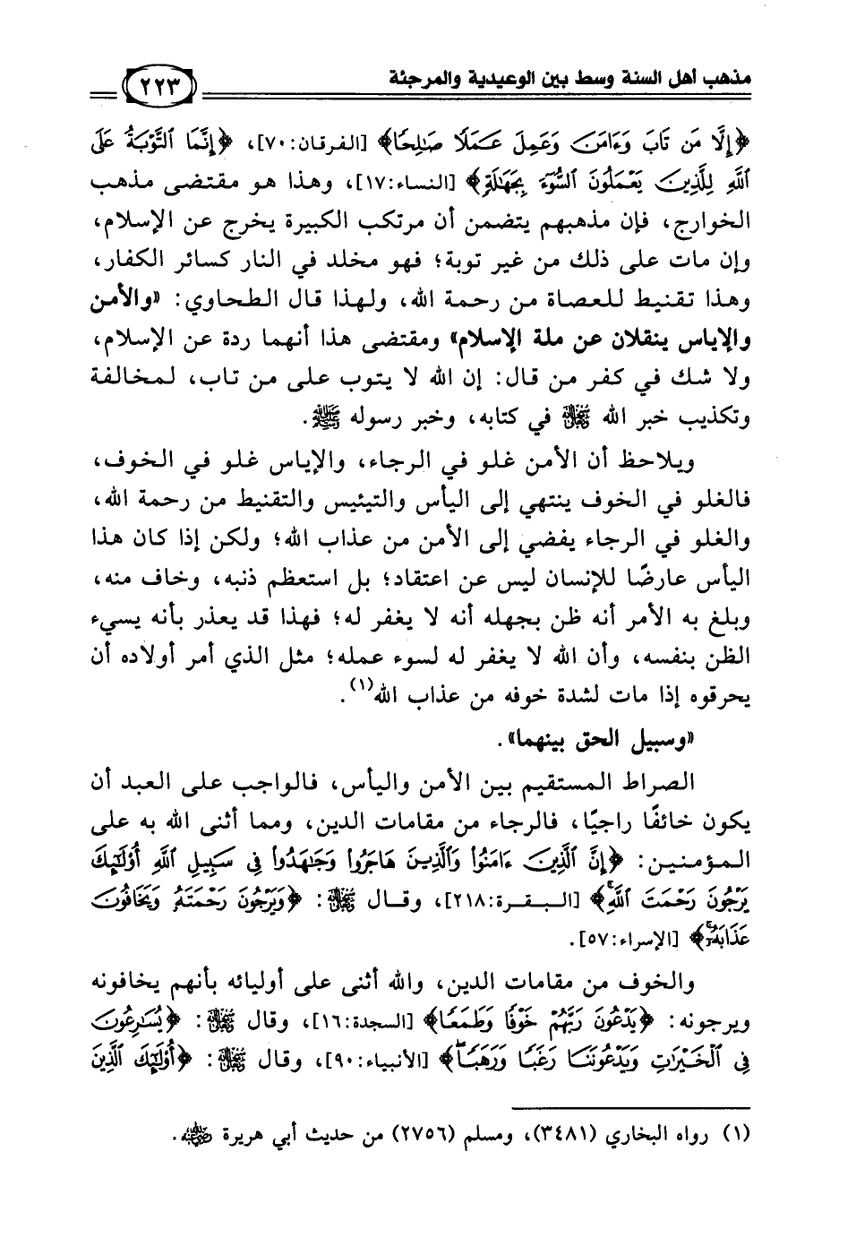 (وسبيل الحق بينهما) الصراط المستقيم بين الأمن واليأس، فالواجب على العبد أن يكون خائفا راجيا، فالرجاء من مقامات الدين، ومما أثنى الله به على المؤمنين: ((إِنَّ الَّذِينَ آمَنُوا وَالَّذِينَ هَاجَرُوا وَجَاهَدُوا فِي سَبِيلِ اللَّهِ أُوْلَئِكَ يَرْجُونَ رَحْمَةَ اللَّهِ)) [البقرة: 218]، وقال سبحانه وتعالى: ((وَيَرْجُونَ رَحْمَتَهُ وَيَخَافُونَ عَذَابَهُ)) [الإسراء: 57].