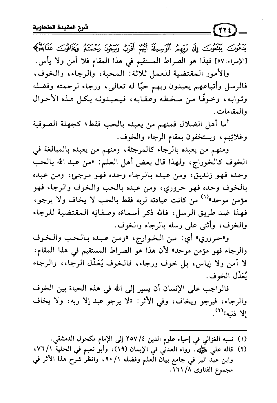 و (حروري) أي: من الخوارج، (ومن عبده بالحب والخوف والرجاء فهو مؤمن موحد) لأن هذا هو الصراط المستقيم في هذا المقام، لا أمن ولا إياس، بل خوف ورجاء، فالخوف يُعَدِّل الرجاء، والرجاء يُعَدِّل الخوف.