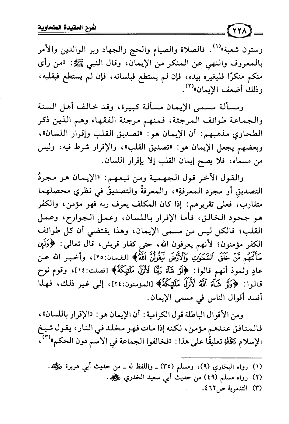 ومسألة مسمى الإيمان مسالة كبيرة، وقد خالف أهل السنة والجماعة طوائف المرجئة، فمنهم مرجئة الفقهاء وهم الذين ذكر الطحاوي مذهبهم: أن الإيمان هو: «تصديق القلب وإقرار اللسان»، وبعضهم يجعل الإيمان هو: «تصديق القلب»، والإقرار شرط فيه، وليس من مسماه، فلا يصح إيمان القلب إلا بإقرار اللسان.
