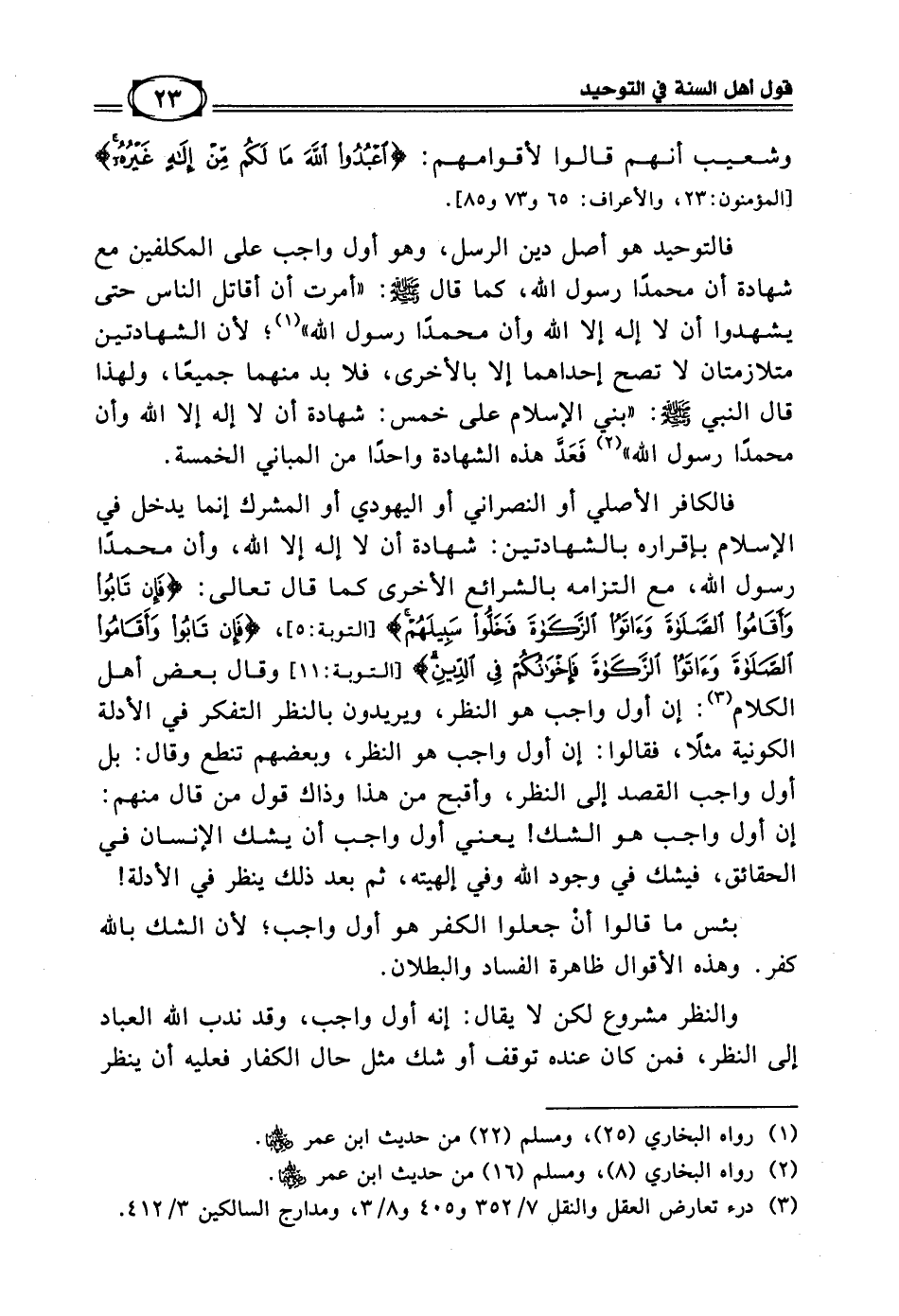 فالكافر الأصلي أو النصراني أو اليهودي أو المشرك إنما يدخل في الإسلام بإقراره بالشهادتين: شهادة أن لا إله إلا الله، وأن محمدا رسول الله، مع التزامه بالشرائع الأخرى كما قال تعالى: ((فَإِنْ تَابُوا وَأَقَامُوا الصَّلاةَ وَآتَوُا الزَّكَاةَ فَخَلُّوا سَبِيلَهُمْ)) [التوبة: 5]، ((فَإِنْ تَابُوا وَأَقَامُوا الصَّلاةَ وَآتَوُا الزَّكَاةَ فَإِخْوَانُكُمْ فِي الدِّينِ)) [التوبة: 11] وقال بعض أهل الكلام (¬3): إن أول واجب هو النظر، ويريدون بالنظر التفكر في الأدلة الكونية مثلا، فقالوا: إن أول واجب هو النظر، وبعضهم تنطع وقال: بل أول واجب القصد إلى النظر، وأقبح من هذا وذاك من قال منهم: إن أول واجب هو الشك! يعني أول واجب أن يشك الإنسان في الحقائق، فيشك في وجود الله وفي إلهيته، ثم بعد ذلك ينظر في الأدلة!
