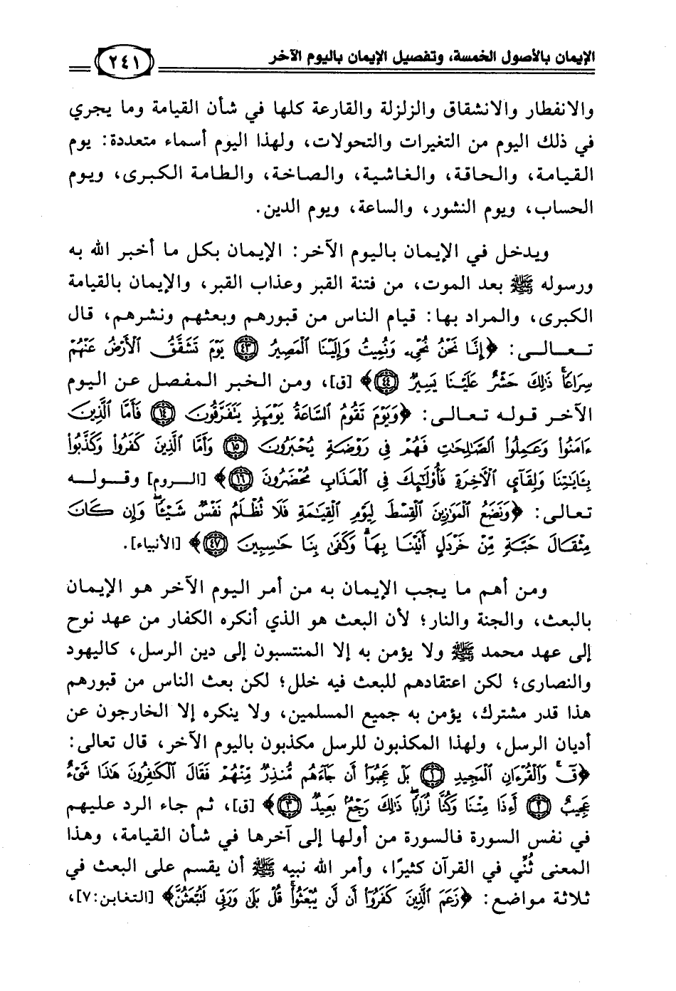 ويدخل في الإيمان باليوم الآخر: الإيمان بكل ما أخبر الله به ورسوله - صلى الله عليه وسلم - بعد الموت، من فتنة القبر وعذاب القبر، والإيمان بالقيامة الكبرى، والمراد بها: قيام الناس من قبورهم وبعثهم ونشرهم، قال تعالى: ((إِنَّا نَحْنُ نُحْيِي وَنُمِيتُ وَإِلَيْنَا الْمَصِيرُ * يَوْمَ تَشَقَّقُ الأَرْضُ عَنْهُمْ سِرَاعَاً ذَلِكَ حَشْرٌ عَلَيْنَا يَسِيرٌ)) [ق: 43 - 44]، ومن الخبر المفصل عن اليوم الآخر قوله تعالى: ((وَيَوْمَ تَقُومُ السَّاعَةُ يَوْمَئِذٍ يَتَفَرَّقُونَ * فَأَمَّا الَّذِينَ آمَنُوا وَعَمِلُوا الصَّالِحَاتِ فَهُمْ فِي رَوْضَةٍ يُحْبَرُونَ * وَأَمَّا الَّذِينَ كَفَرُوا وَكَذَّبُوا بِآيَاتِنَا وَلِقَاءِ الآخِرَةِ فَأُوْلَئِكَ فِي الْعَذَابِ مُحْضَرُونَ)) [الروم: 14 - 16] وقوله تعالى: ((وَنَضَعُ الْمَوَازِينَ الْقِسْطَ لِيَوْمِ الْقِيَامَةِ فَلا تُظْلَمُ نَفْسٌ شَيْئَاً وَإِنْ كَانَ مِثْقَالَ حَبَّةٍ مِنْ خَرْدَلٍ أَتَيْنَا بِهَا وَكَفَى بِنَا حَاسِبِينَ)) [الأنبياء: 47].