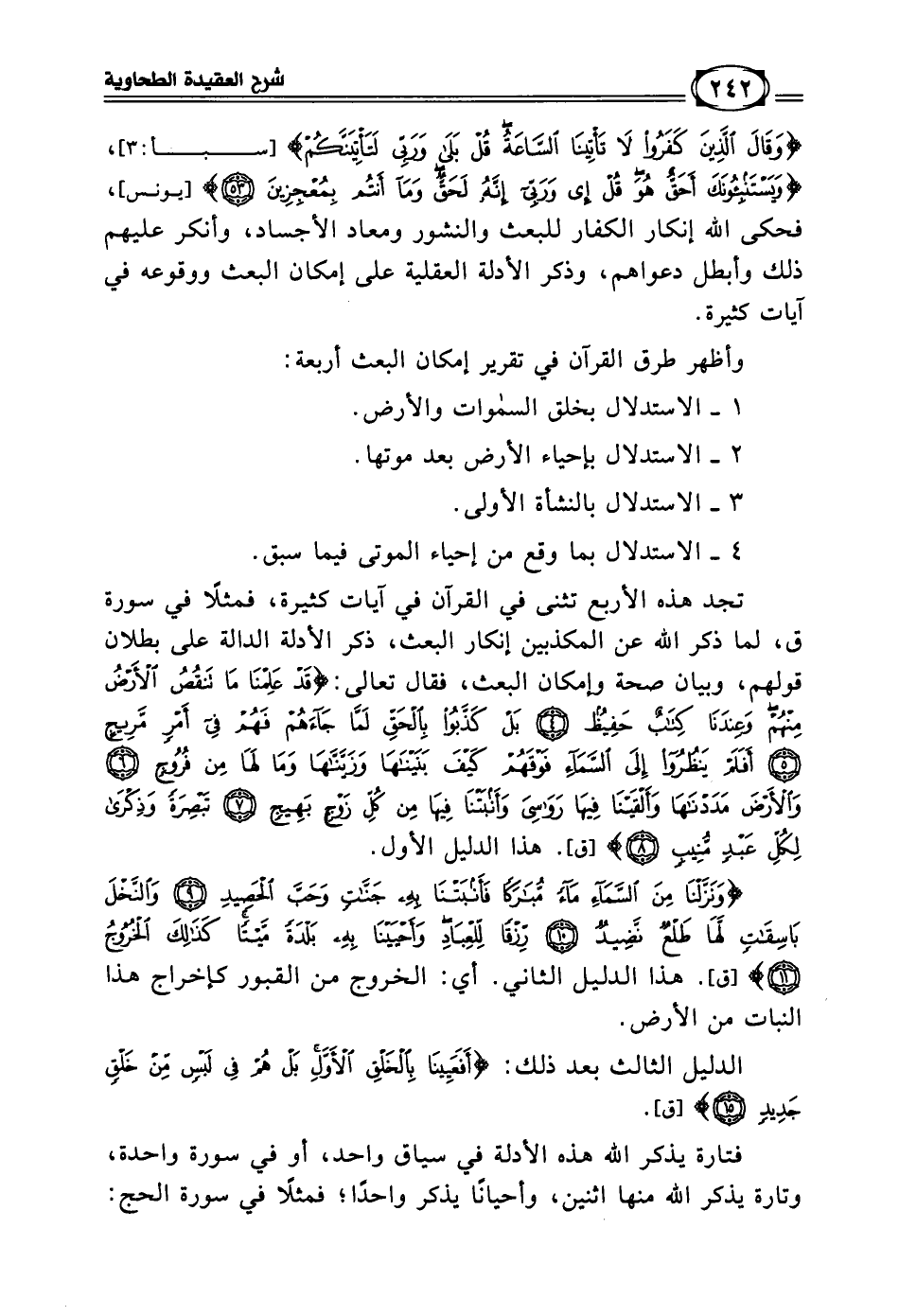 تجد هذه الأربع تثنى في القرآن في آيات كثيرة، فمثلا في سورة ق، لما ذكر الله عن المكذبين إنكار البعث، ذكر الأدلة الدالة على بطلان قولهم، وبيان صحة وإمكان البعث، فقال تعالى: ((قَدْ عَلِمْنَا مَا تَنْقُصُ الأَرْضُ مِنْهُمْ وَعِنْدَنَا كِتَابٌ حَفِيظٌ * بَلْ كَذَّبُوا بِالْحَقِّ لَمَّا جَاءَهُمْ فَهُمْ فِي أَمْرٍ مَرِيجٍ * أَفَلَمْ يَنْظُرُوا إِلَى السَّمَاءِ فَوْقَهُمْ كَيْفَ بَنَيْنَاهَا وَزَيَّنَّاهَا وَمَا لَهَا مِنْ فُرُوجٍ * وَالأَرْضَ مَدَدْنَاهَا وَأَلْقَيْنَا فِيهَا رَوَاسِيَ وَأَنْبَتْنَا فِيهَا مِنْ كُلِّ زَوْجٍ بَهِيجٍ * تَبْصِرَةً وَذِكْرَى لِكُلِّ عَبْدٍ مُنِيبٍ)) [ق: 4 - 8]. هذا الدليل الأول.