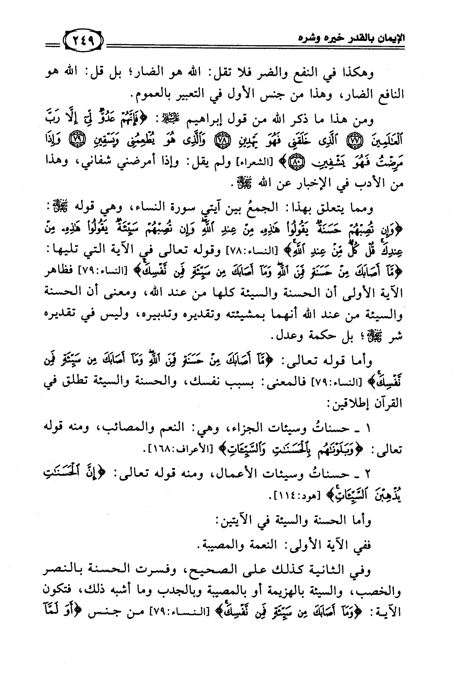 ومما يتعلق بهذا الجمعُ بين آيتي سورة النساء، وهي قوله سبحانه وتعالى: ((وَإِن تُصِبْهُمْ حَسَنَةٌ يَقُولُواْ هَذِهِ مِنْ عِندِ اللهِ وَإِن تُصِبْهُمْ سَيِّئَةٌ يَقُولُواْ هَذِهِ مِنْ عِندِكَ كُلٌّ مِنْ عِنْدِ اللَّهِ)) [النساء: 78] وقوله تعالى في الآية التي تليها: ((مَا أَصَابَكَ مِنْ حَسَنَةٍ فَمِنَ اللَّهِ وَمَا أَصَابَكَ مِنْ سَيِّئَةٍ فَمِنْ نَفْسِكَ)) [النساء: 79] فظاهر الآية الأولى أن الحسنة والسيئة كلها من عند الله، ومعنى أن الحسنة والسيئة من عند الله أنهما بمشيئته وتقديره وتدبيره، وليس في تقديره شر سبحانه وتعالى؛ بل حكمة وعدل.