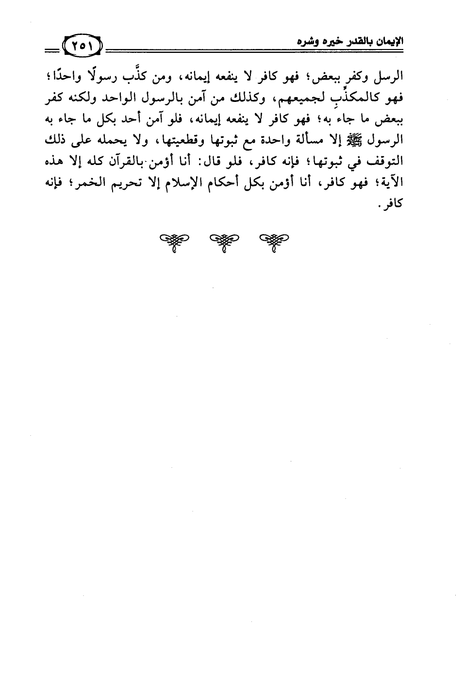 الرسل وكفر ببعض؛ فهو كافر لا ينفعه إيمانه، ومن كذَّب رسولا واحدا؛ فهو كالمكذِّبِ لجميعهم، وكذلك من آمن بالرسول الواحد ولكنه كفر ببعض ما جاء به؛ فهو كافر لا ينفعه إيمانه، فلو آمن أحد بكل ما جاء به الرسول - صلى الله عليه وسلم - إلا مسألة واحدة مع ثبوتها وقطعيتها، ولا يحمله على ذلك التوقف في ثبوتها؛ فإنه كافر، فلو قال: أنا أؤمن بالقرآن كله إلا هذه الآية؛ فهو كافر، أنا أؤمن بكل أحكام الإسلام إلا تحريم الخمر؛ فإنه كافر.
