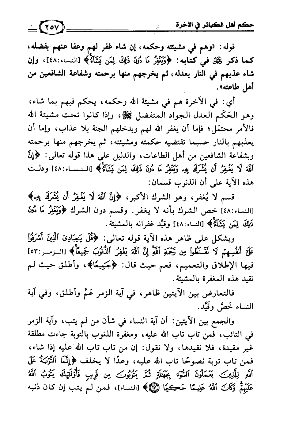 ويشكل على ظاهر هذه الآية قوله تعالى: ((قُلْ يَا عِبَادِيَ الَّذِينَ أَسْرَفُوا عَلَى أَنْفُسِهِمْ لا تَقْنَطُوا مِنْ رَحْمَةِ اللَّهِ إِنَّ اللَّهَ يَغْفِرُ الذُّنُوبَ جَمِيعَاً)) [الزمر: 53] فيها الإطلاق والتعميم، فعم حيث قال: ((جَمِيعَاً))، وأطلق حيث لم تقيد هذه المغفرة بالمشيئة.