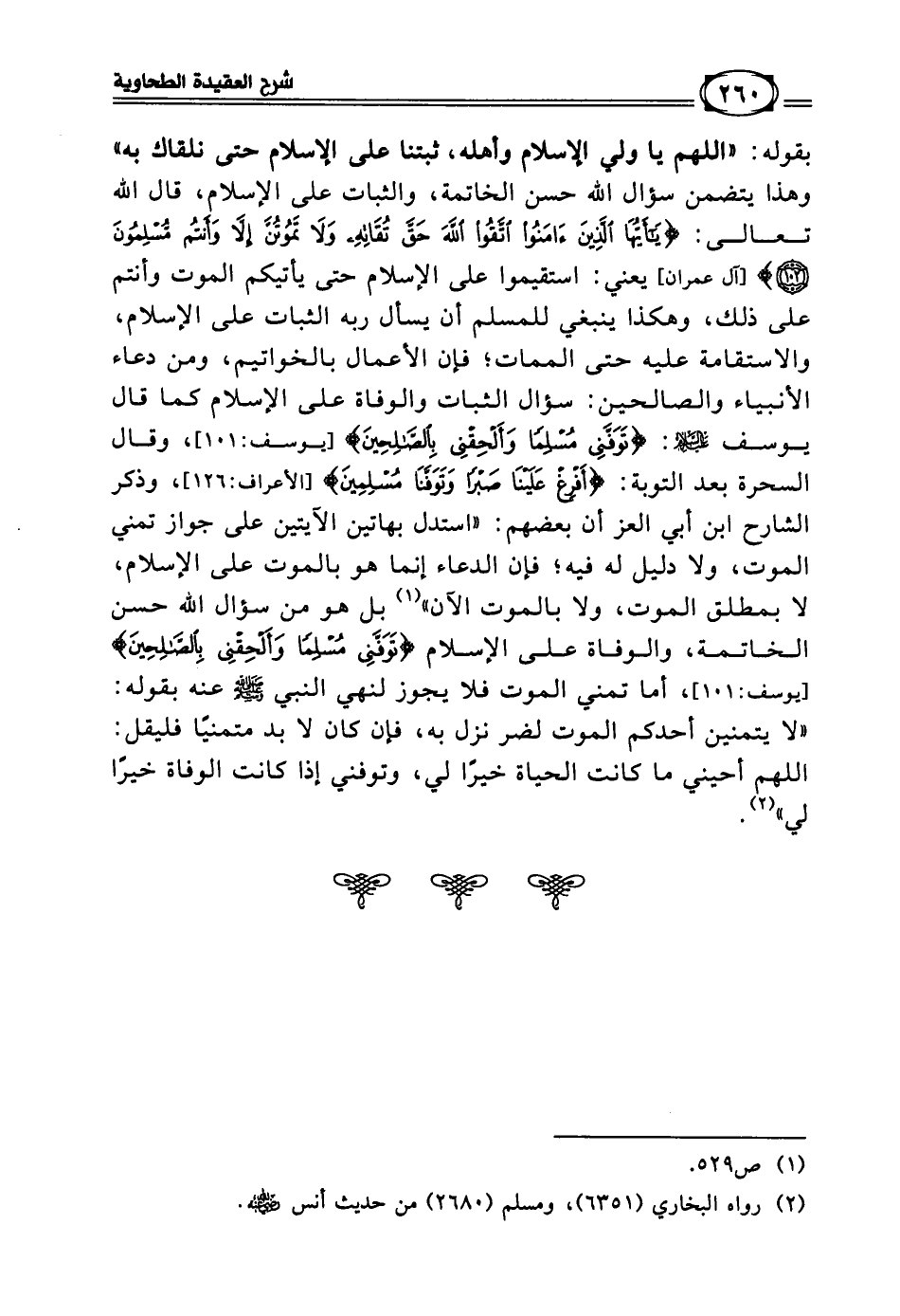 بقوله: (اللهم يا ولي الإسلام وأهله، ثبتنا على الإسلام حتى نلقاك به) وهذا يتضمن سؤال الله حسن الخاتمة، والثبات على الإسلام، قال الله تعالى: ((يَا أَيُّهَا الَّذِينَ آمَنُوا اتَّقُوا اللَّهَ حَقَّ تُقَاتِهِ وَلا تَمُوتُنَّ إِلَّا وَأَنْتُمْ مُسْلِمُونَ)) [آل عمران: 102] يعني: استقيموا على الإسلام حتى يأتيكم الموت وأنتم على ذلك، وهكذا ينبغي للمسلم أن يسأل ربه الثبات على الإسلام، والاستقامة عليه حتى الممات؛ فإن الأعمال بالخواتيم، ومن دعاء الأنبياء والصالحين: سؤال الثبات والوفاة على الإسلام كما قال يوسف عليه السلام: ((تَوَفَّنِي مُسْلِمَاً وَأَلْحِقْنِي بِالصَّالِحِينَ)) [يوسف: 101]، وقال السحرة بعد التوبة: ((أَفْرِغْ عَلَيْنَا صَبْرَاً وَتَوَفَّنَا مُسْلِمِينَ)) [الأعراف: 126]، وذكر الشارح ابن أبي العز أن بعضهم: «استدل بهاتين الآيتين على جواز تمني الموت، ولا دليل له فيه؛ فإن الدعاء إنما هو بالموت على الإسلام، لا بمطلق الموت، ولا بالموت الآن» (¬1) بل هو من سؤال الله حسن الخاتمة، والوفاة على الإسلام ((تَوَفَّنِي مُسْلِمَاً وَأَلْحِقْنِي بِالصَّالِحِينَ)) [يوسف: 101]، أما تمني الموت فلا يجوز لنهي النبي - صلى الله عليه وسلم - عنه بقوله: «لا يتمنين أحدكم الموت لضر نزل به، فإن كان لا بد متمنيا فليقل: اللهم أحيني ما كانت الحياة خيرا لي، وتوفني إذا كانت الوفاة خيراً لي». (¬2)
