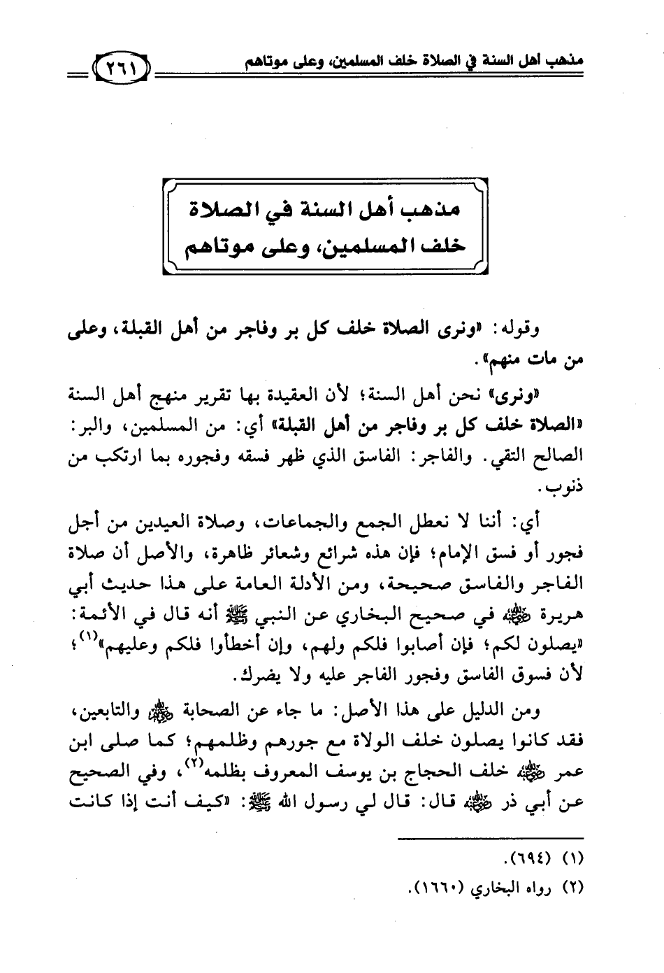 (ونرى) نحن أهل السنة؛ لأن العقيدة بها تقرير منهج أهل السنة (الصلاة خلف كل بر وفاجر من أهل القبلة) أي: من المسلمين، والبر: الصالح التقي. والفاجر: الفاسق الذي ظهر فسقه وفجوره بما ارتكب من ذنوب.