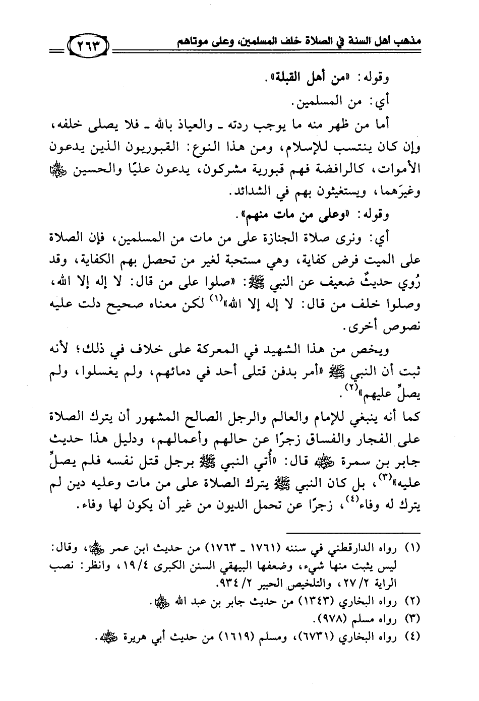 ويخص من هذا شهيد في المعركة على خلاف في ذلك؛ لأنه ثبت أن النبي - صلى الله عليه وسلم - «أمر بدفن قتلى أحد في دمائهم، ولم يغسلوا، ولم يصلِّ عليهم» (¬2)، كما أنه ينبغي للإمام والعالم والرجل الصالح المشهور أن يترك الصلاة على الفجار والفساق زجرا عن حالهم وأعمالهم، ودليل هذا حديث جابر بن سمرة - رضي الله عنه - قال: «أُتي النبي - صلى الله عليه وسلم - برجل قتل نفسه فلم يصلِّ عليه» (¬3)، بل كان النبي - صلى الله عليه وسلم - يترك الصلاة على من مات وعليه دين لم يترك له وفاء (¬4)، زجرا عن تحمل الديون من غير أن يكون لها وفاء.