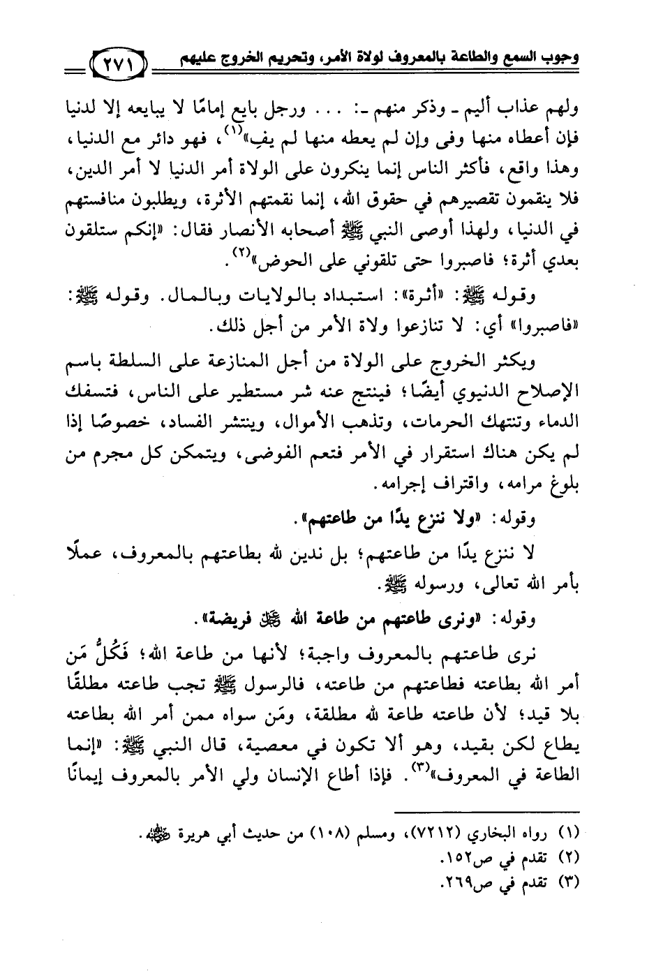 نرى طاعتهم بالمعروف واجبة؛ لأنها من طاعة الله؛ فَكُلُ مَن أمر الله بطاعته فطاعتهم من طاعته، فالرسول - صلى الله عليه وسلم - تجب طاعته مطلقا بلا قيد؛ لأن طاعته طاعة لله مطلقة، ومَن سواه ممن أمر الله بطاعته يطاع لكن بقيد، وهو ألا تكون في معصية، قال النبي - صلى الله عليه وسلم -: (إنما الطاعة في المعروف) (¬3). فإذا الإنسان أطاع ولي الأمر بالمعروف إيمانا